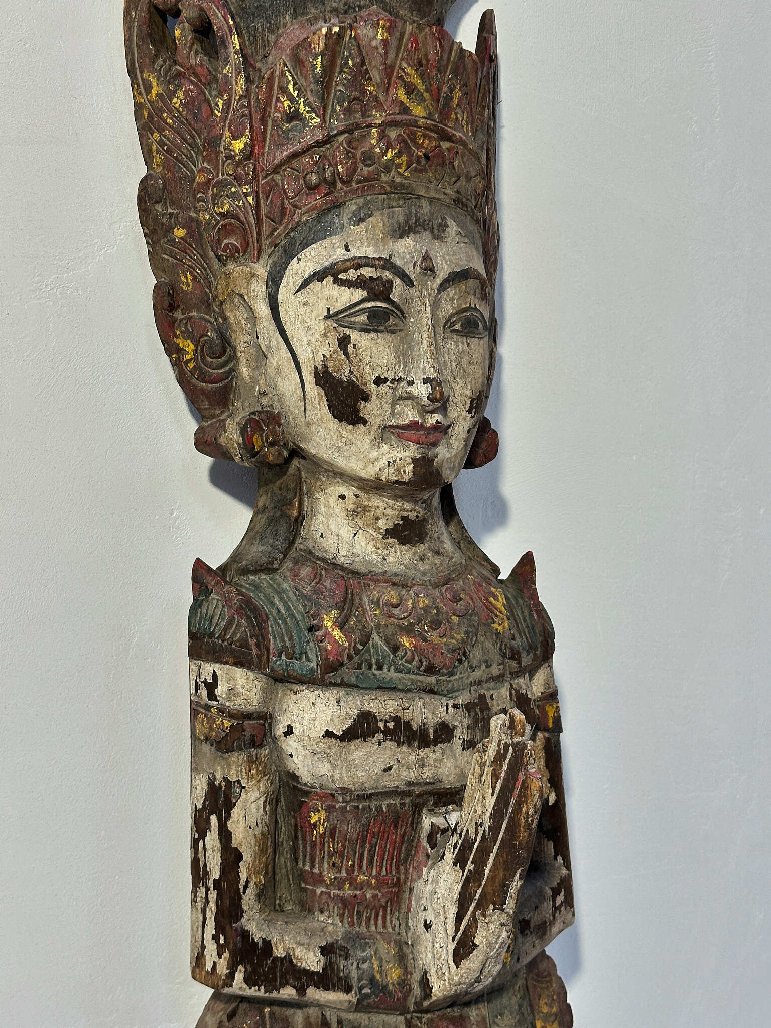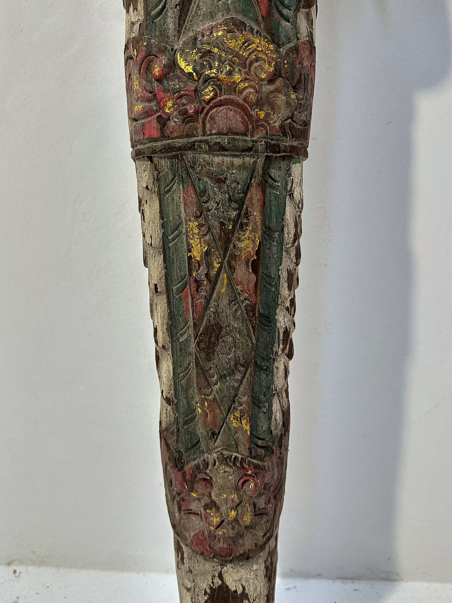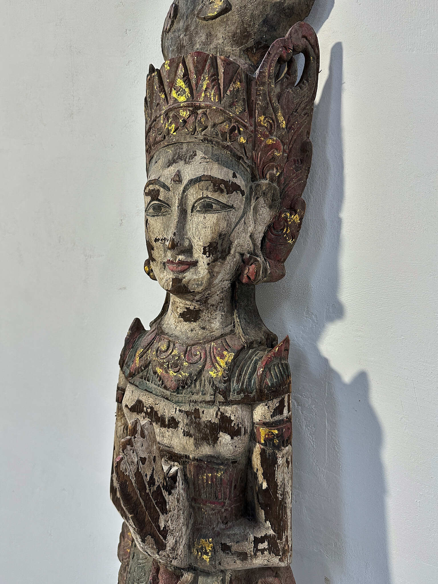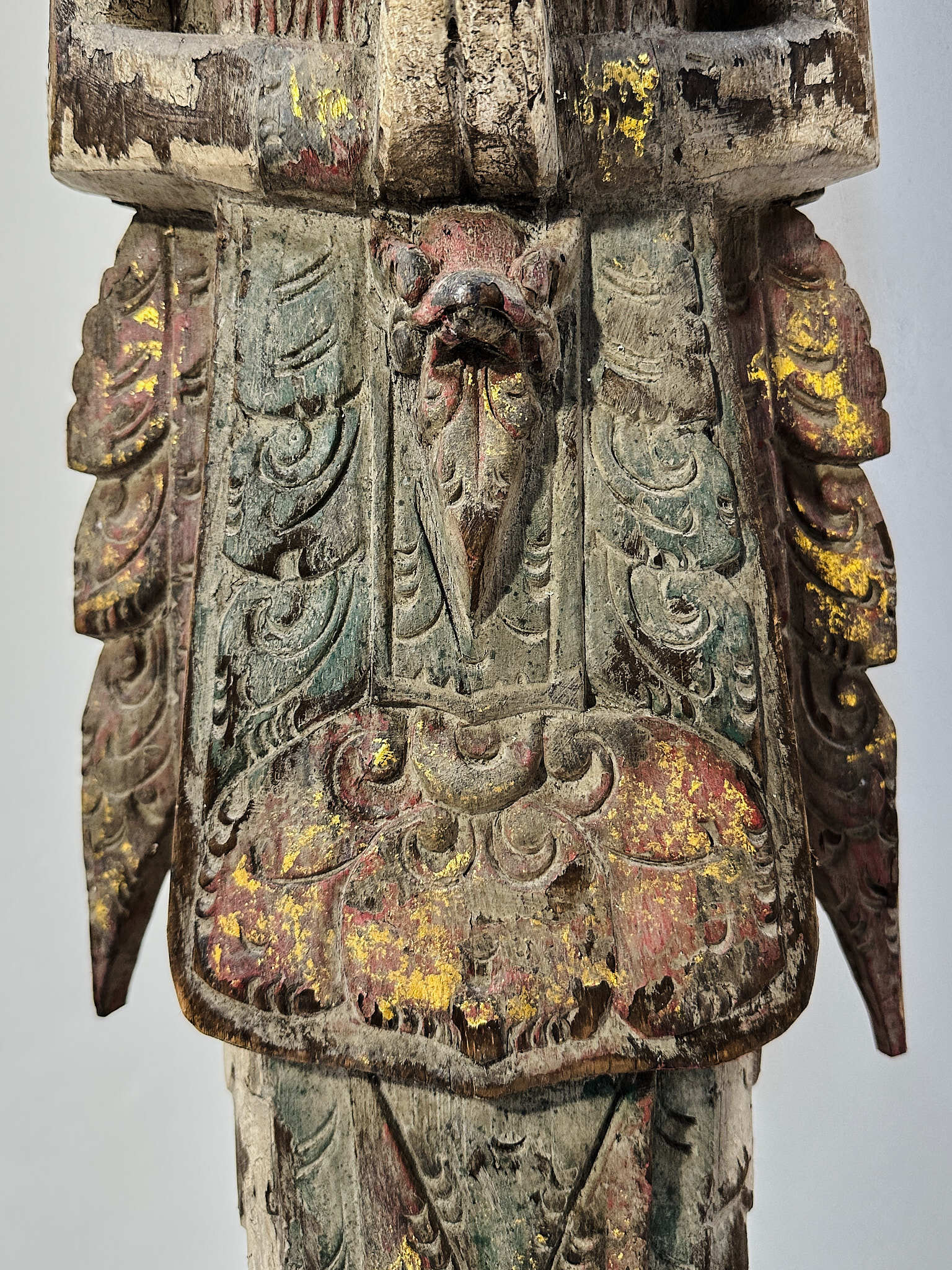 手彫りならではの繊細な造形に加え、着色の枯れ具合が絶妙で、時を経た木肌との調和が見事。