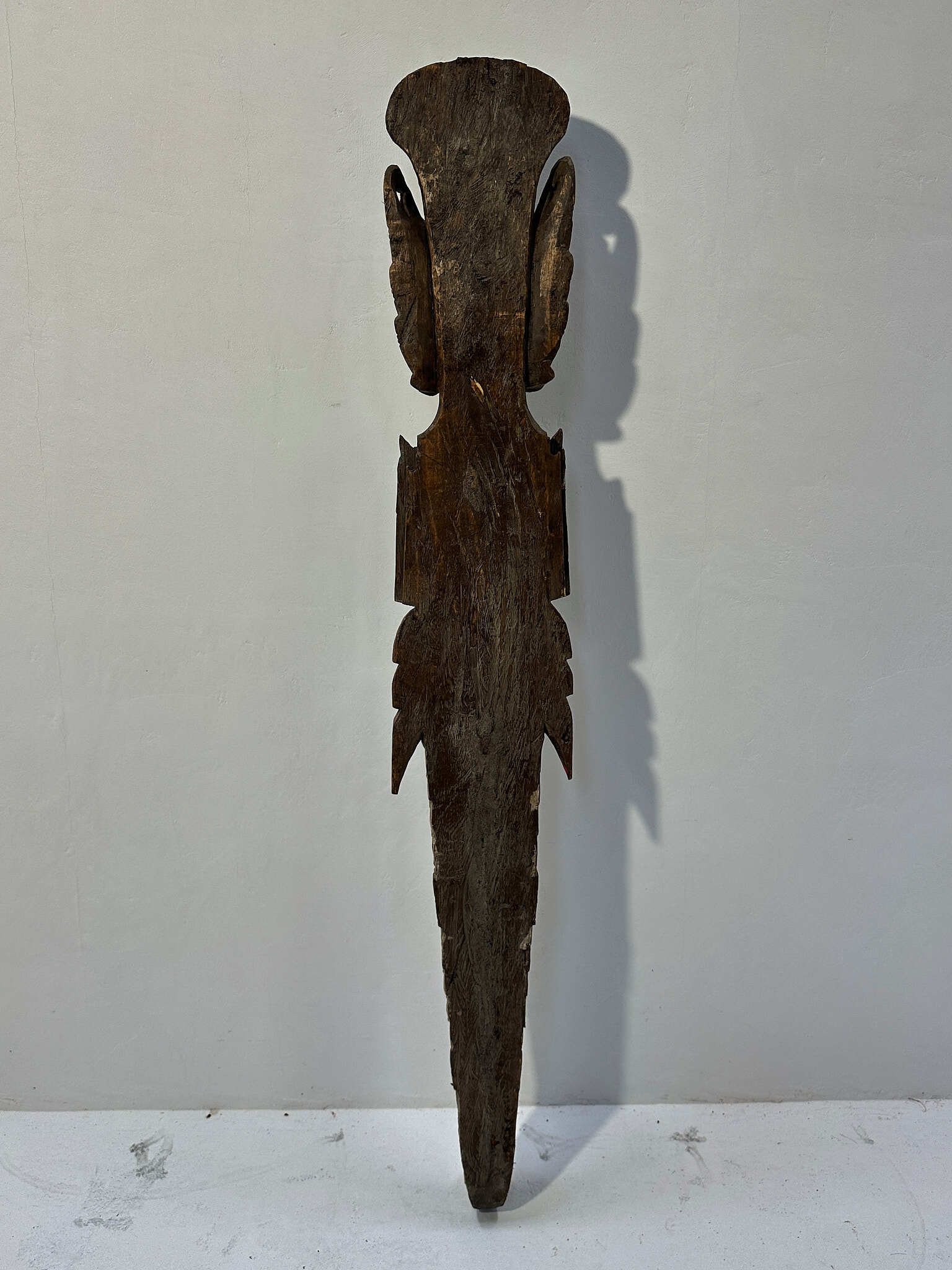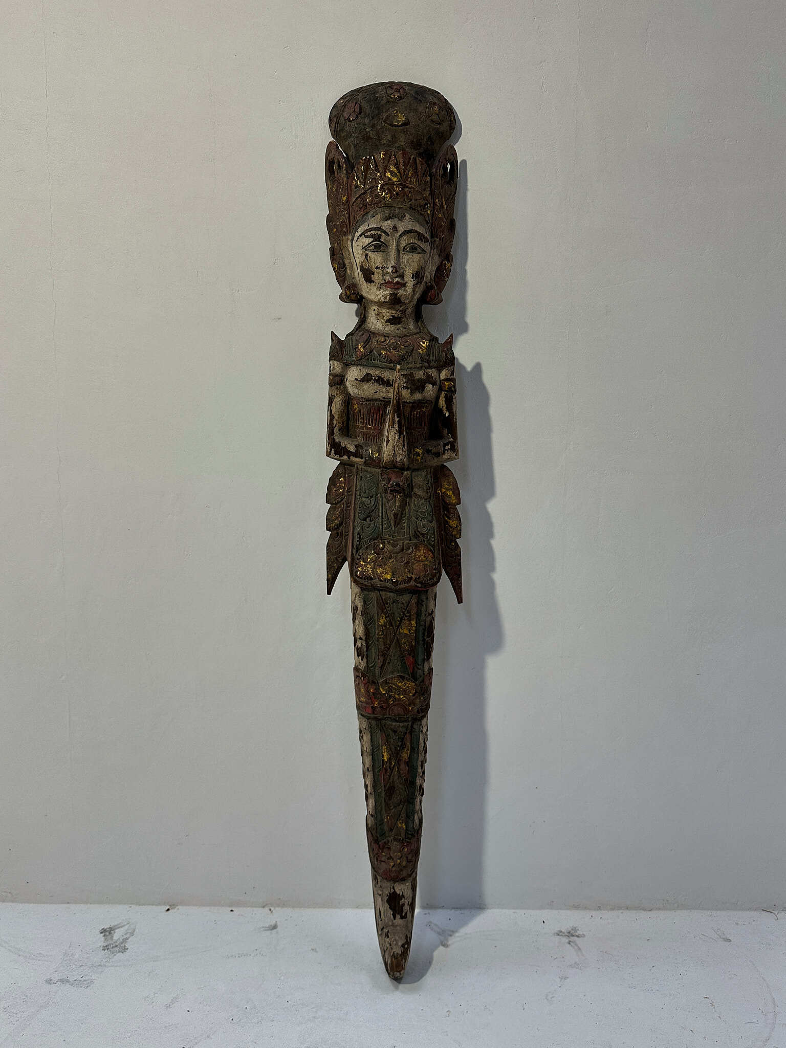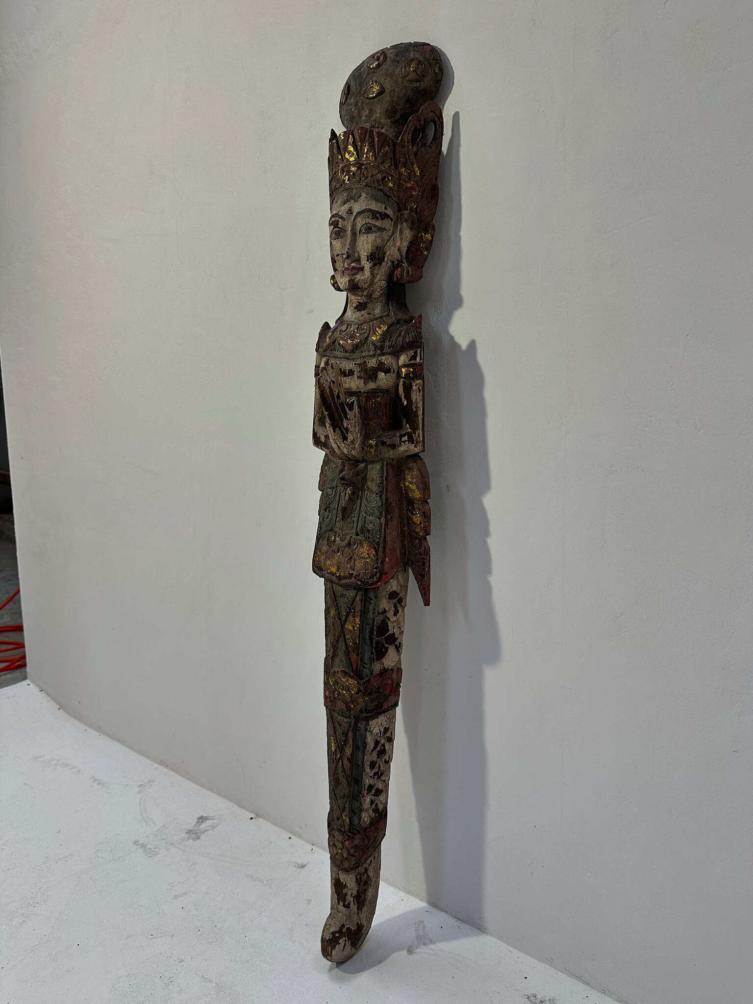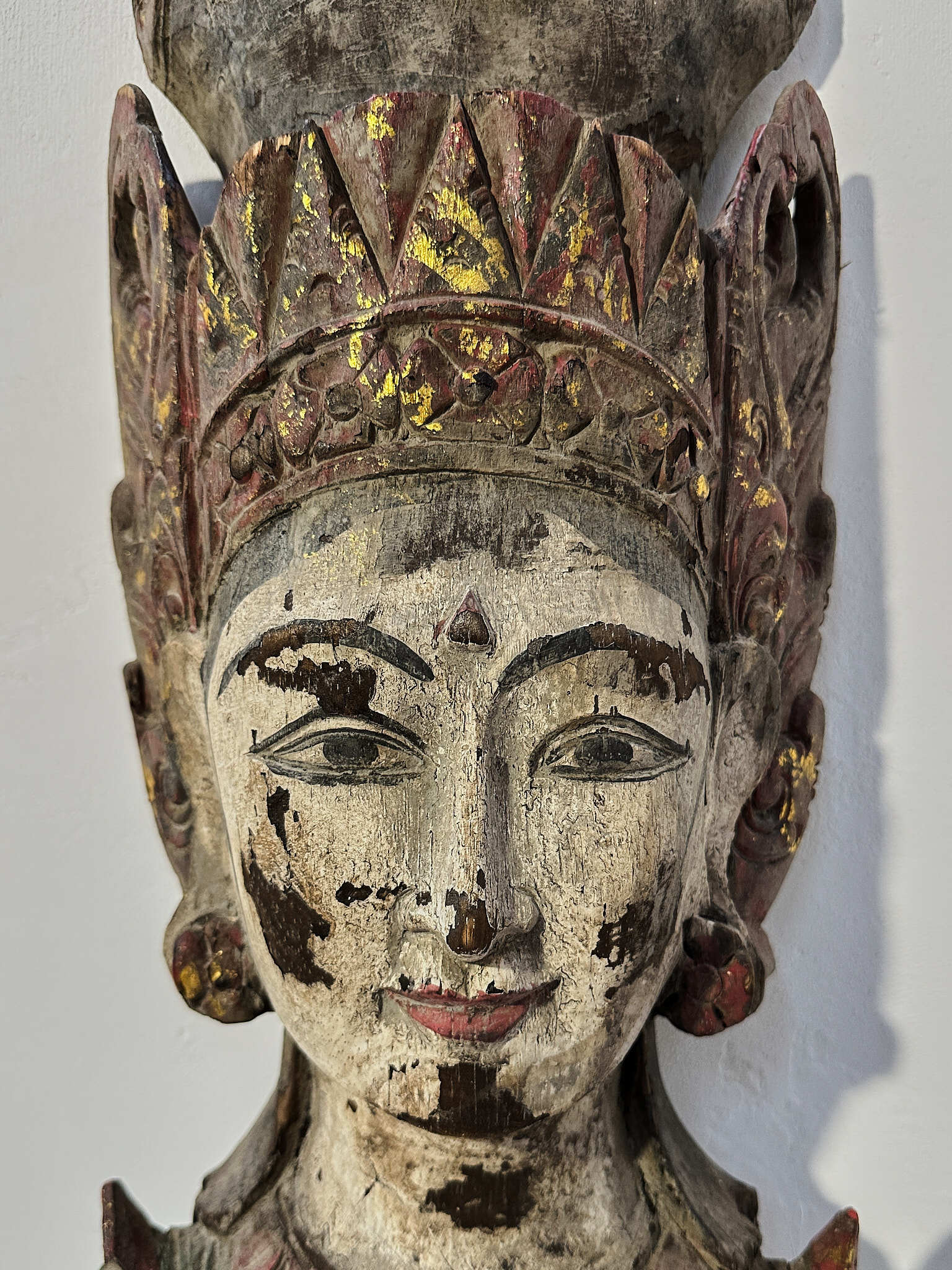 手彫りならではの繊細な造形に加え、着色の枯れ具合が絶妙で、時を経た木肌との調和が見事。