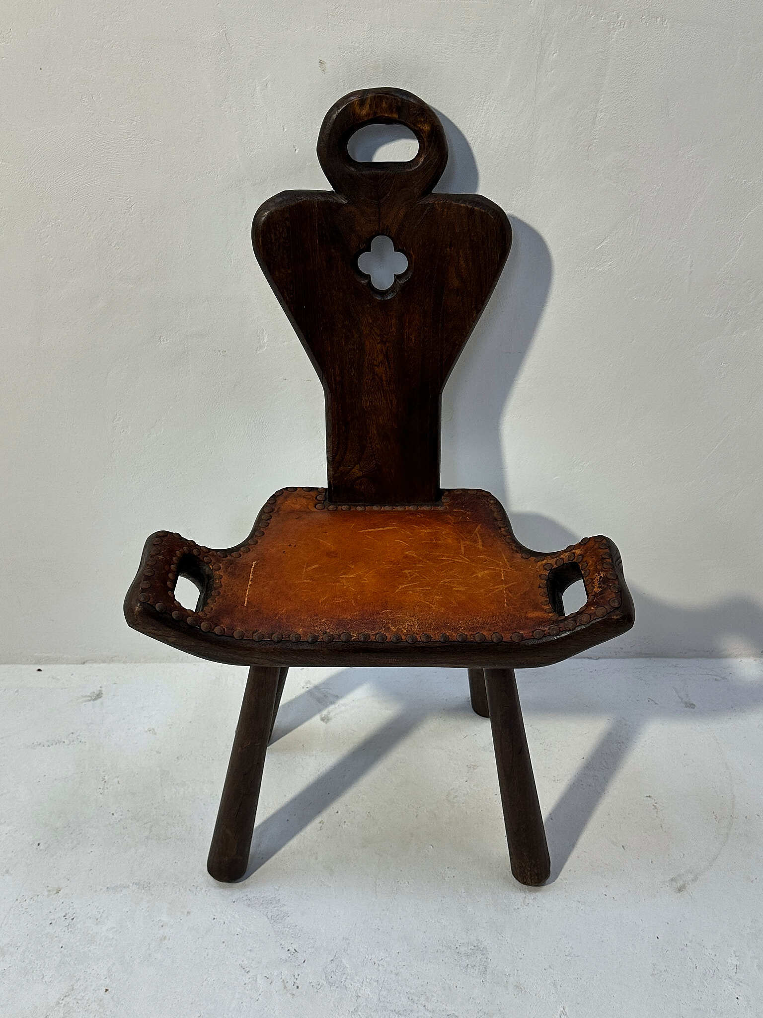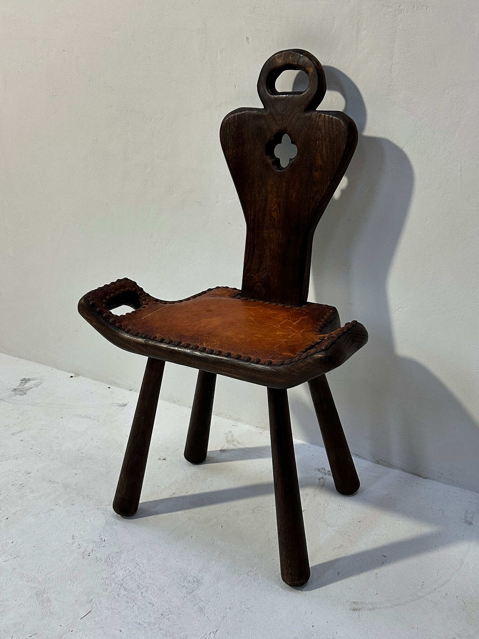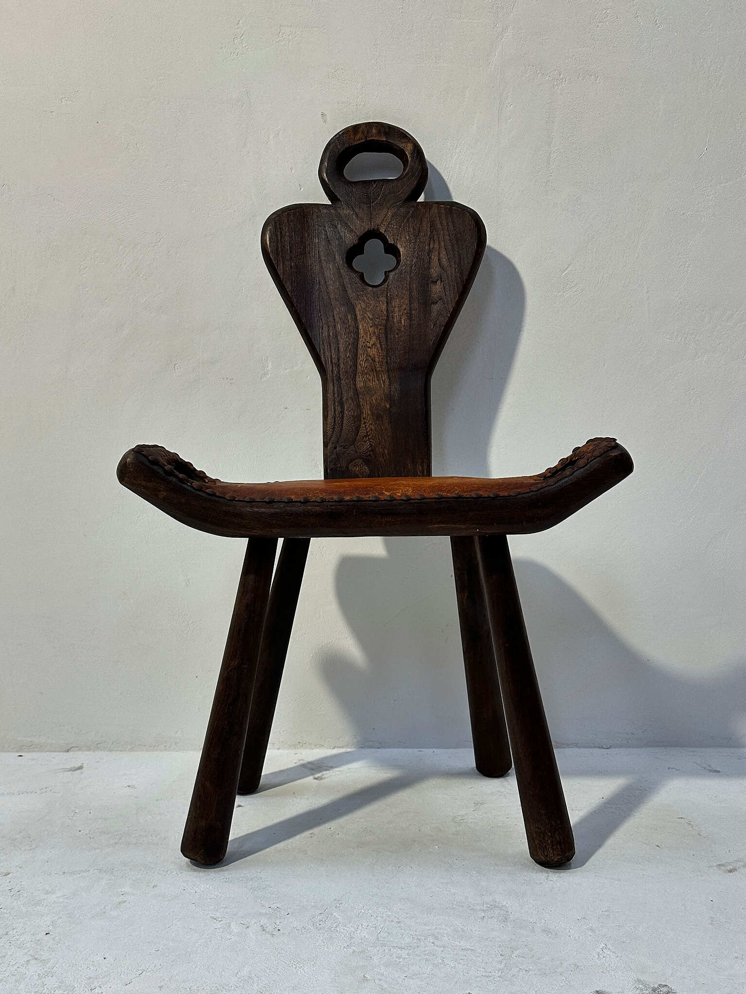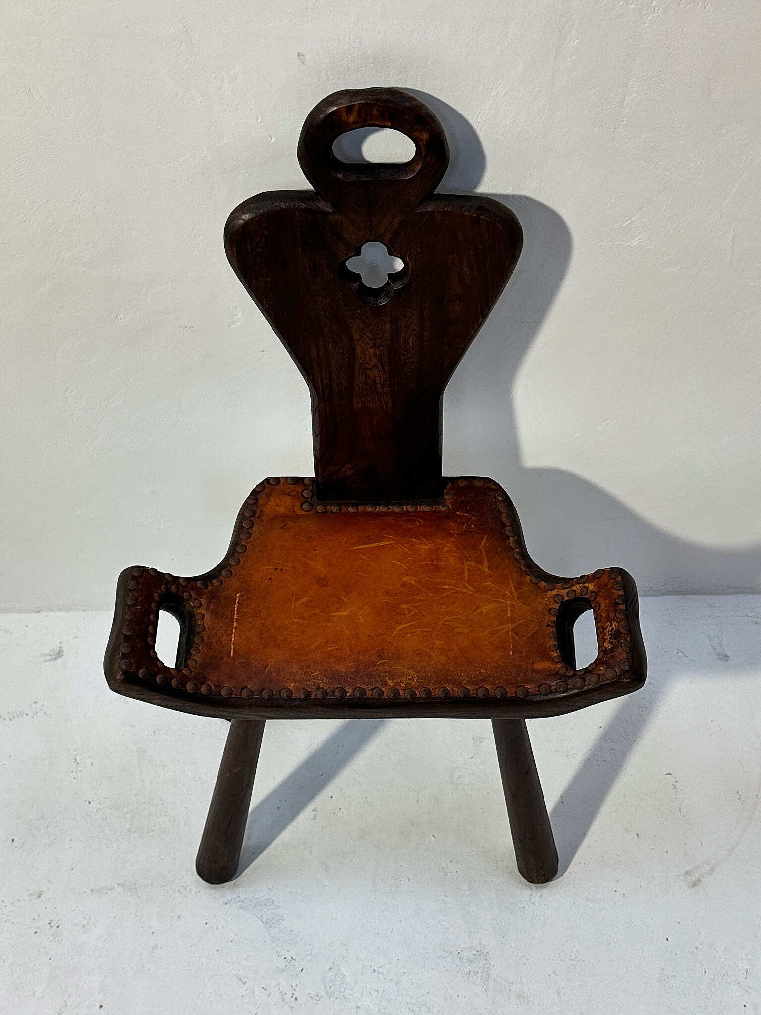 厚みのある無垢材に革張りの座面を鋲で留めた、素朴で力強い佇まい。