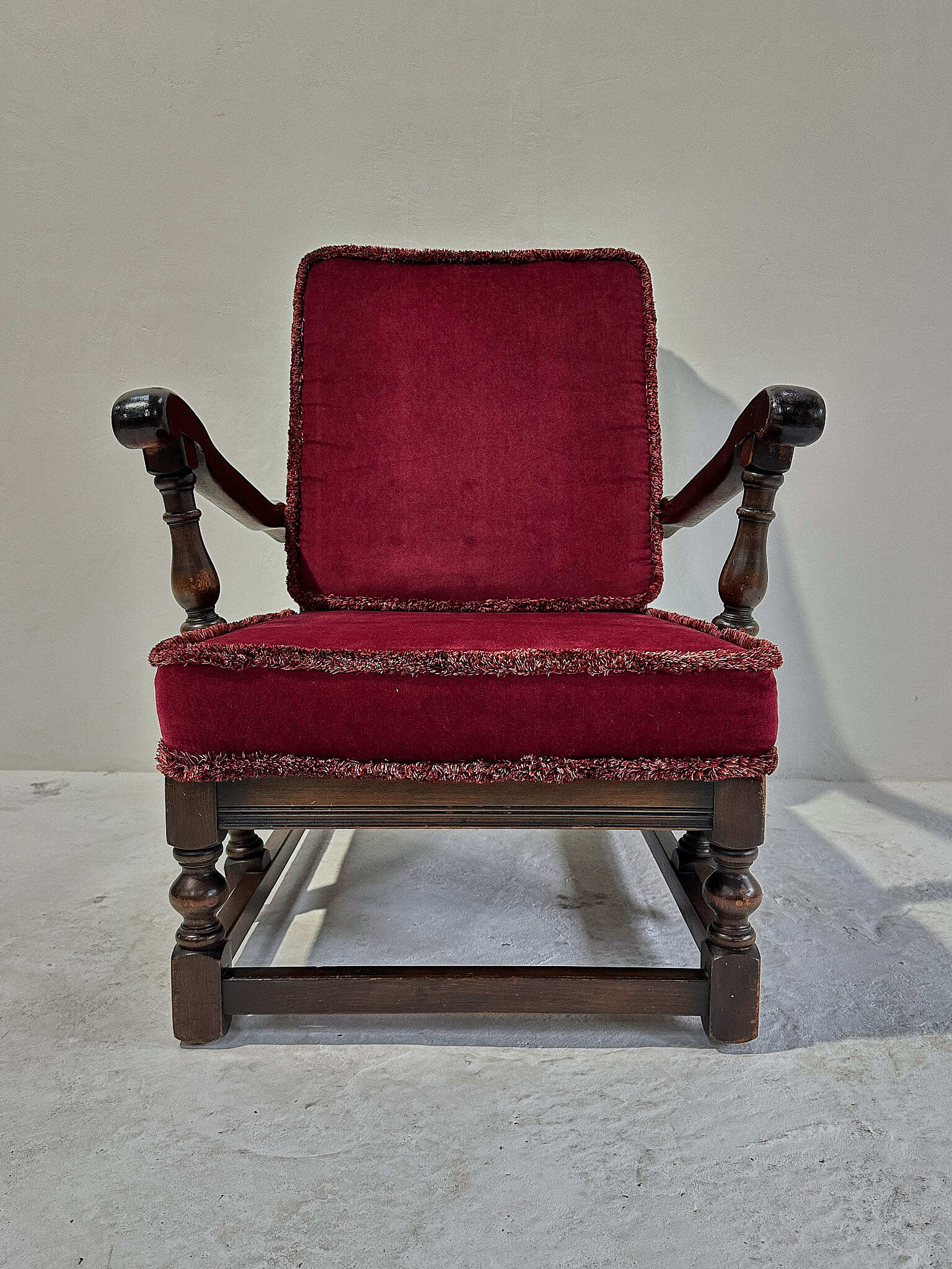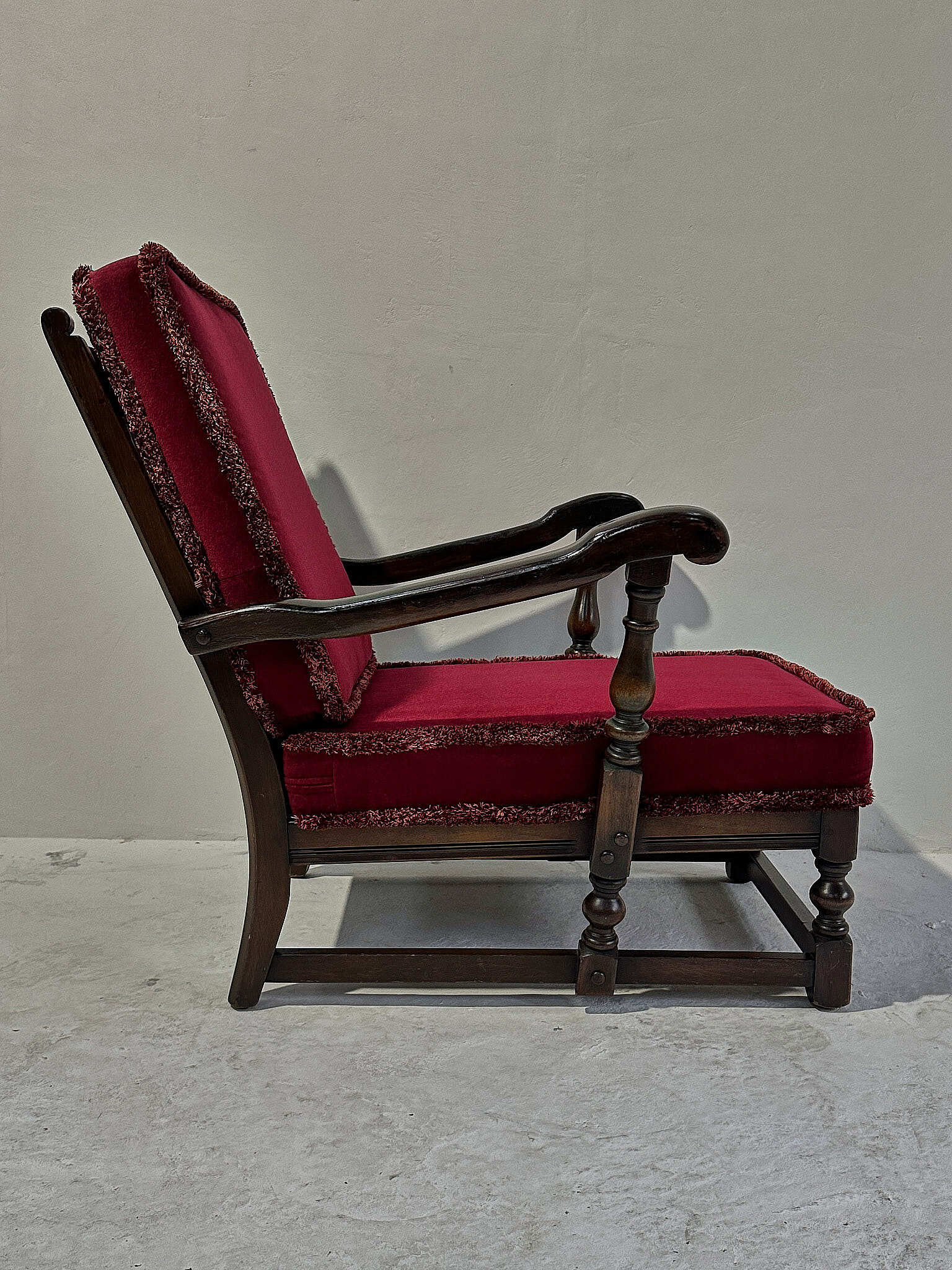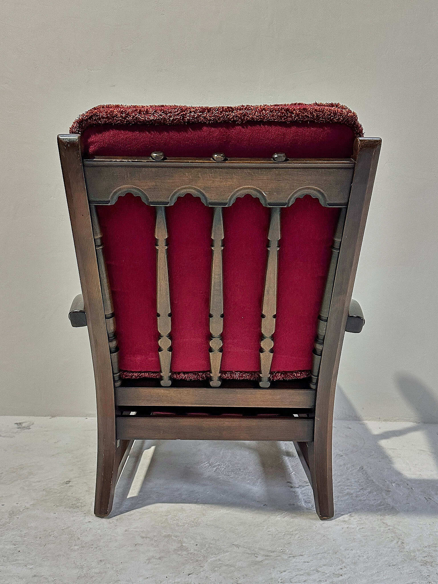 深みのあるマホガニー調のフレームに、落ち着いたワインレッドのベルベット生地がよく映えます。