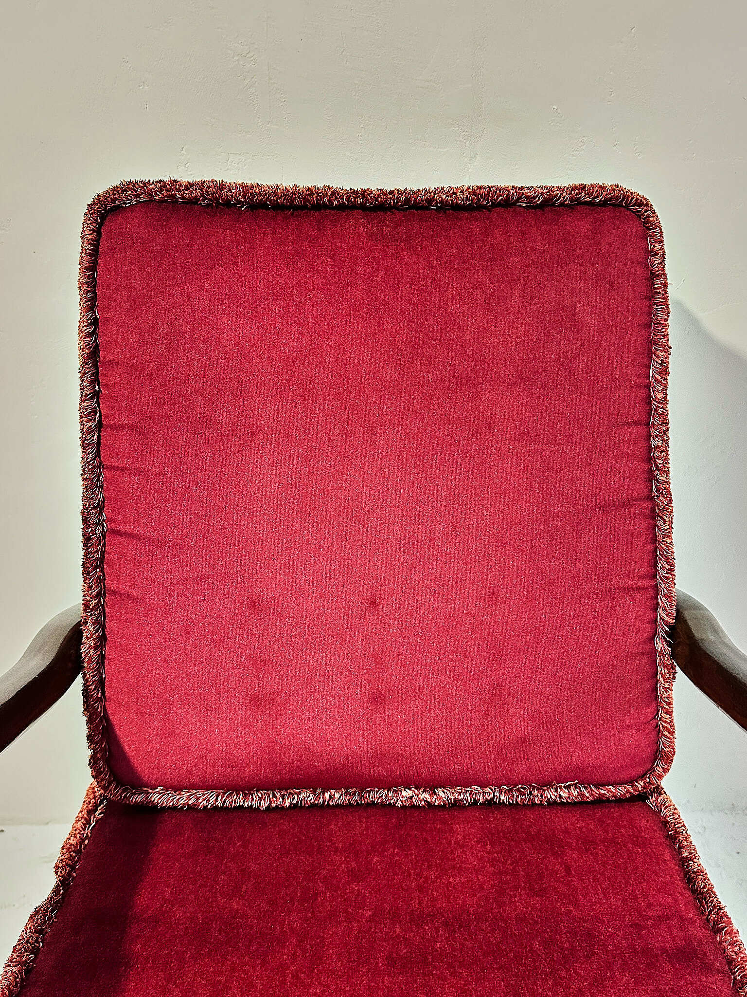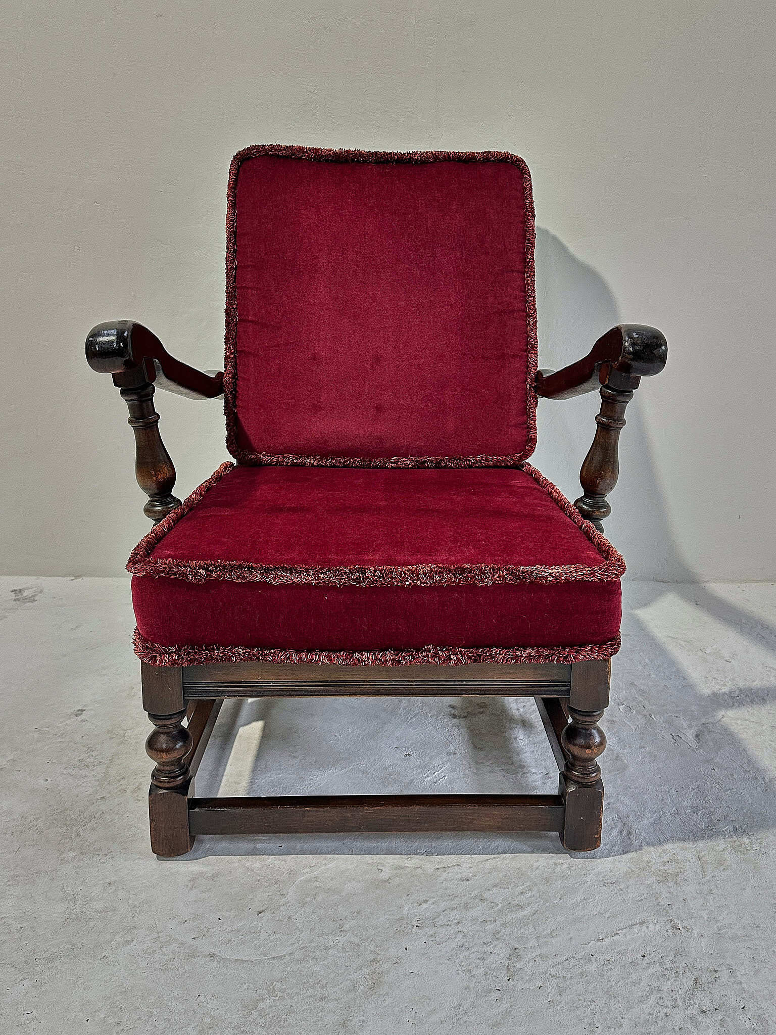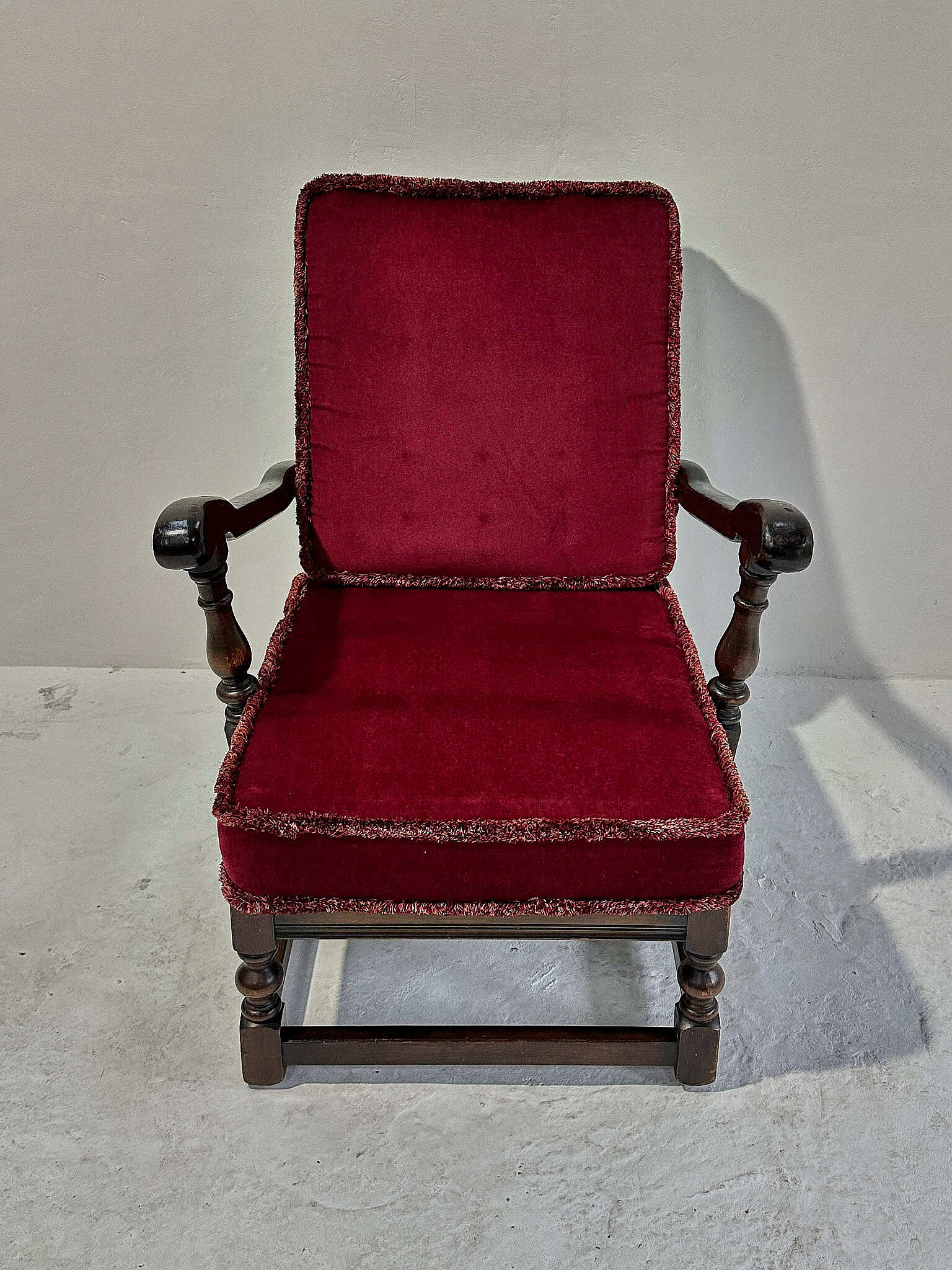 深みのあるマホガニー調のフレームに、落ち着いたワインレッドのベルベット生地がよく映えます。