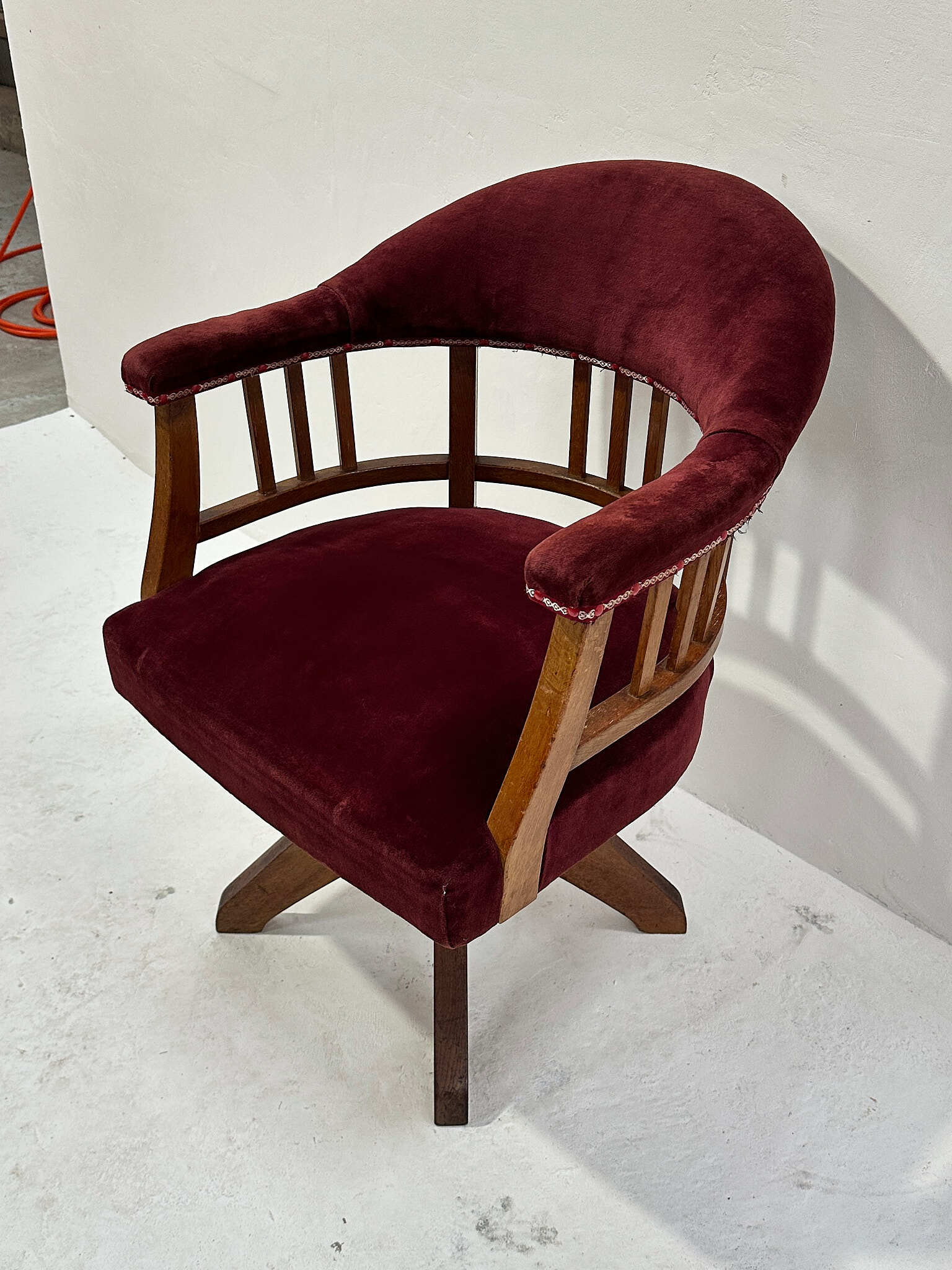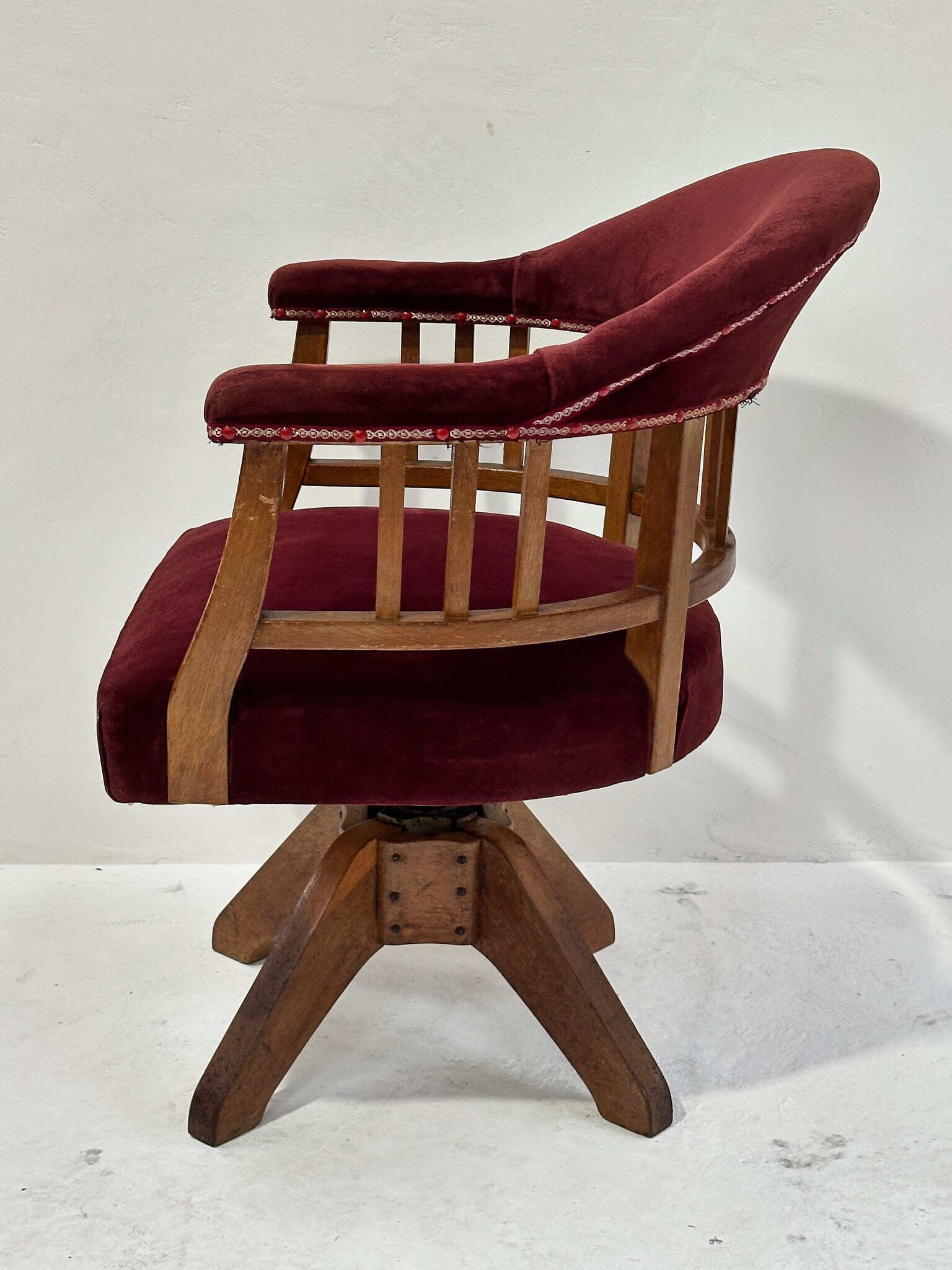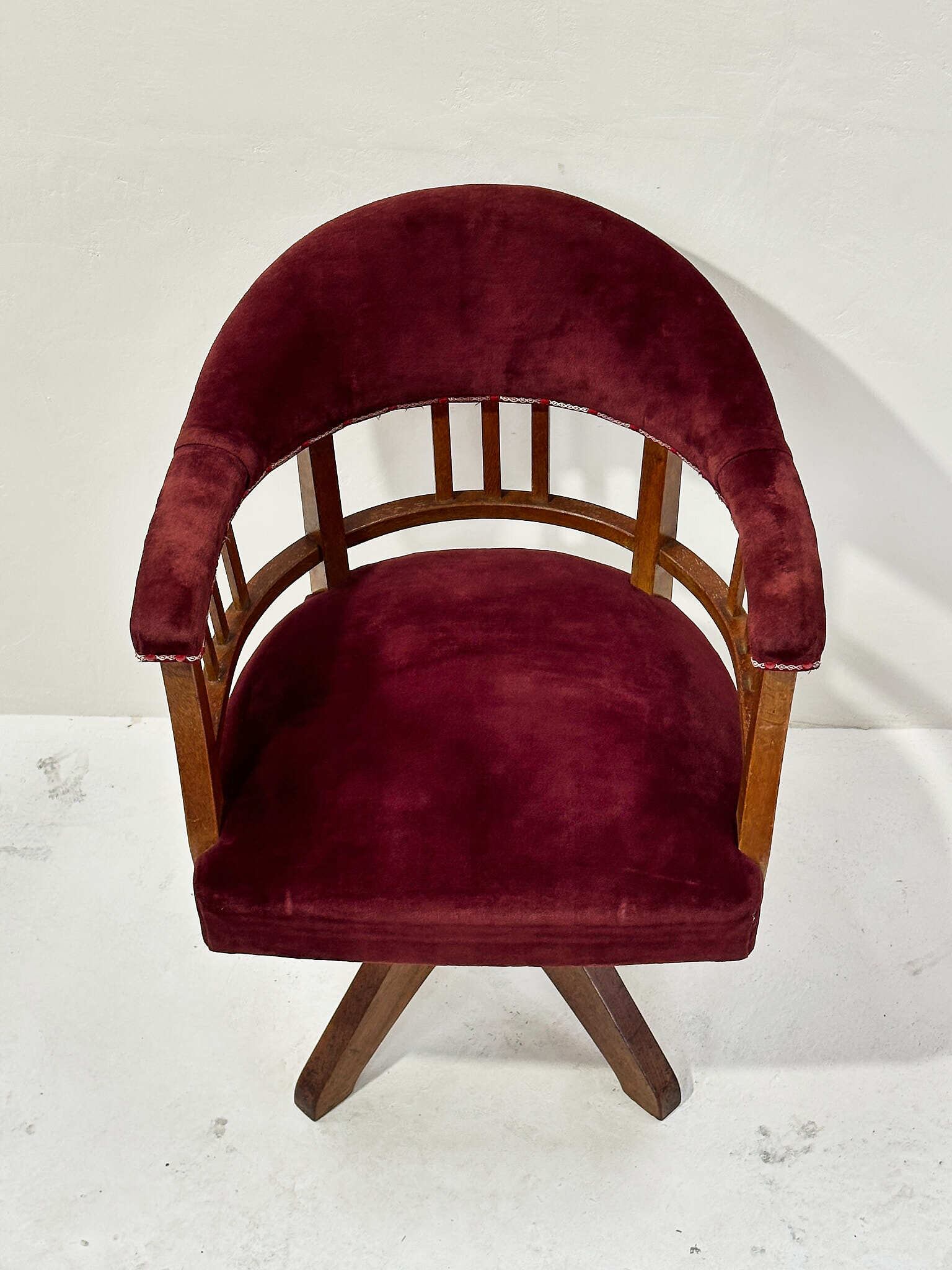 経年で深まった木部の艶と、生地の柔らかな質感が心地よく、書斎や店舗の雰囲気づくりにもおすすめの一脚です。