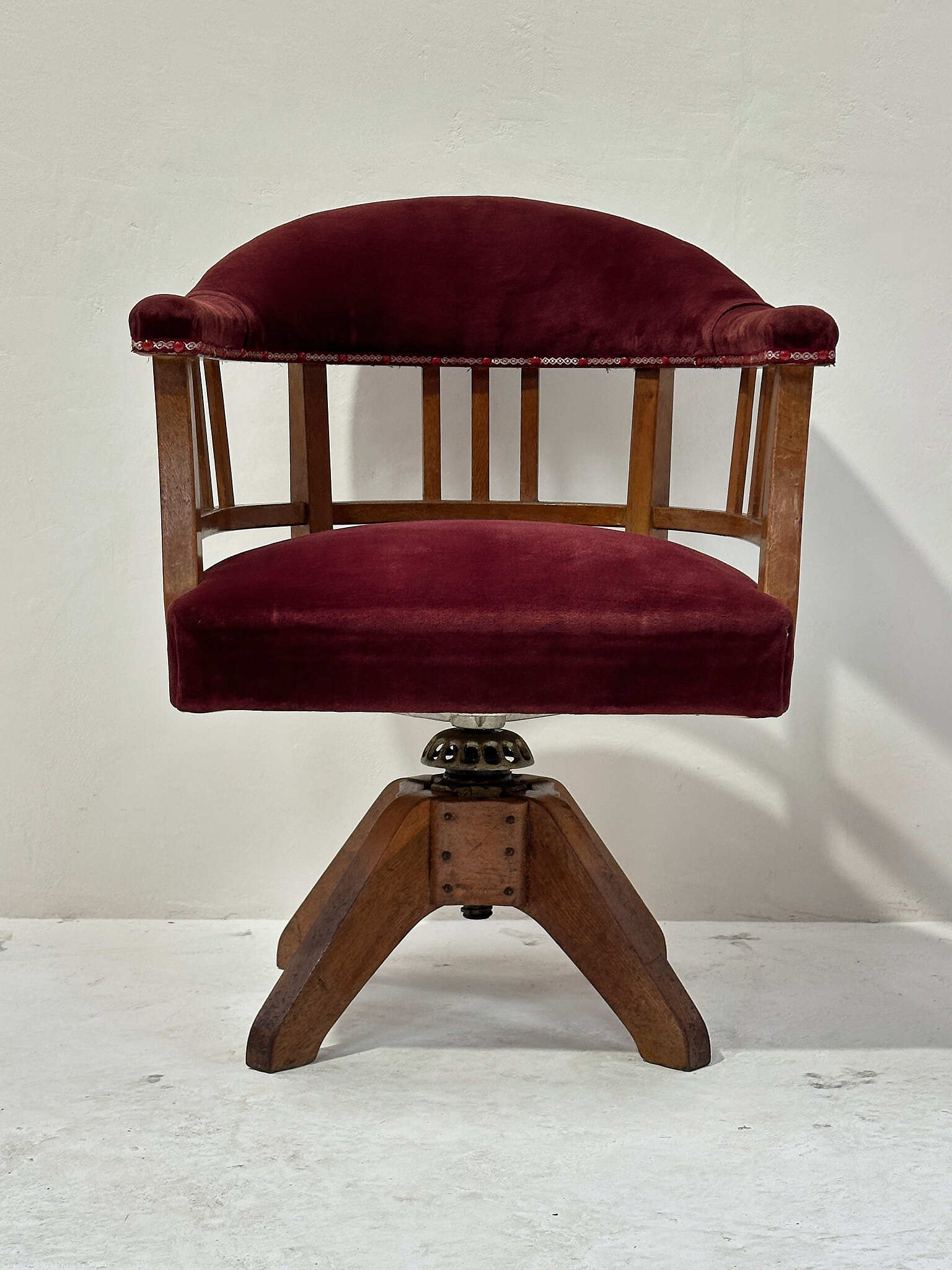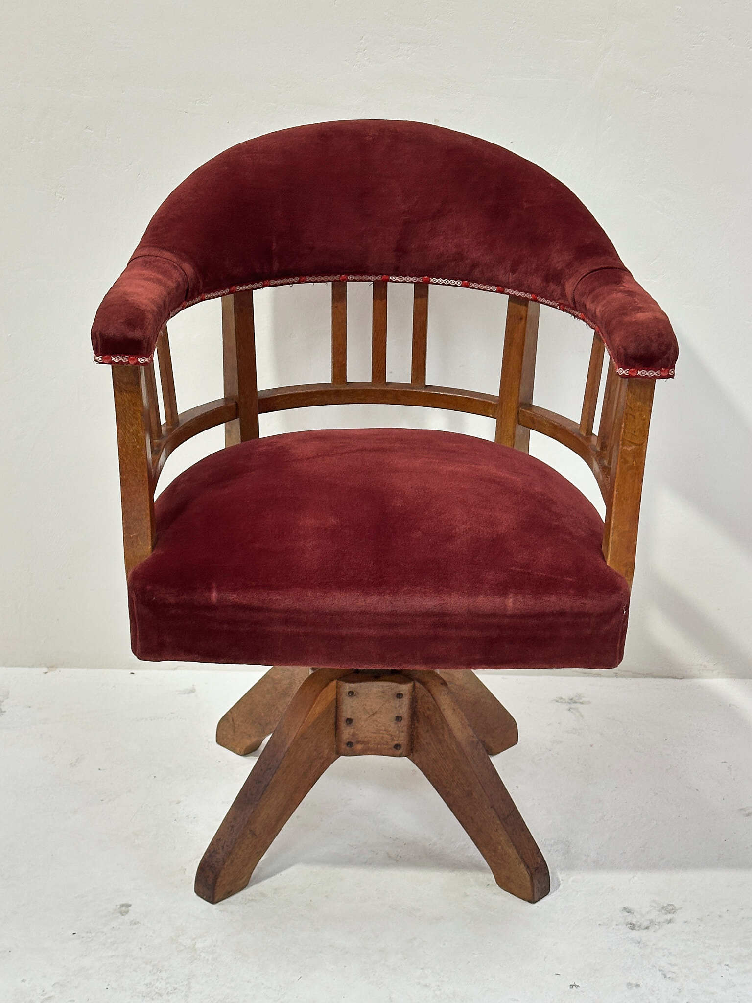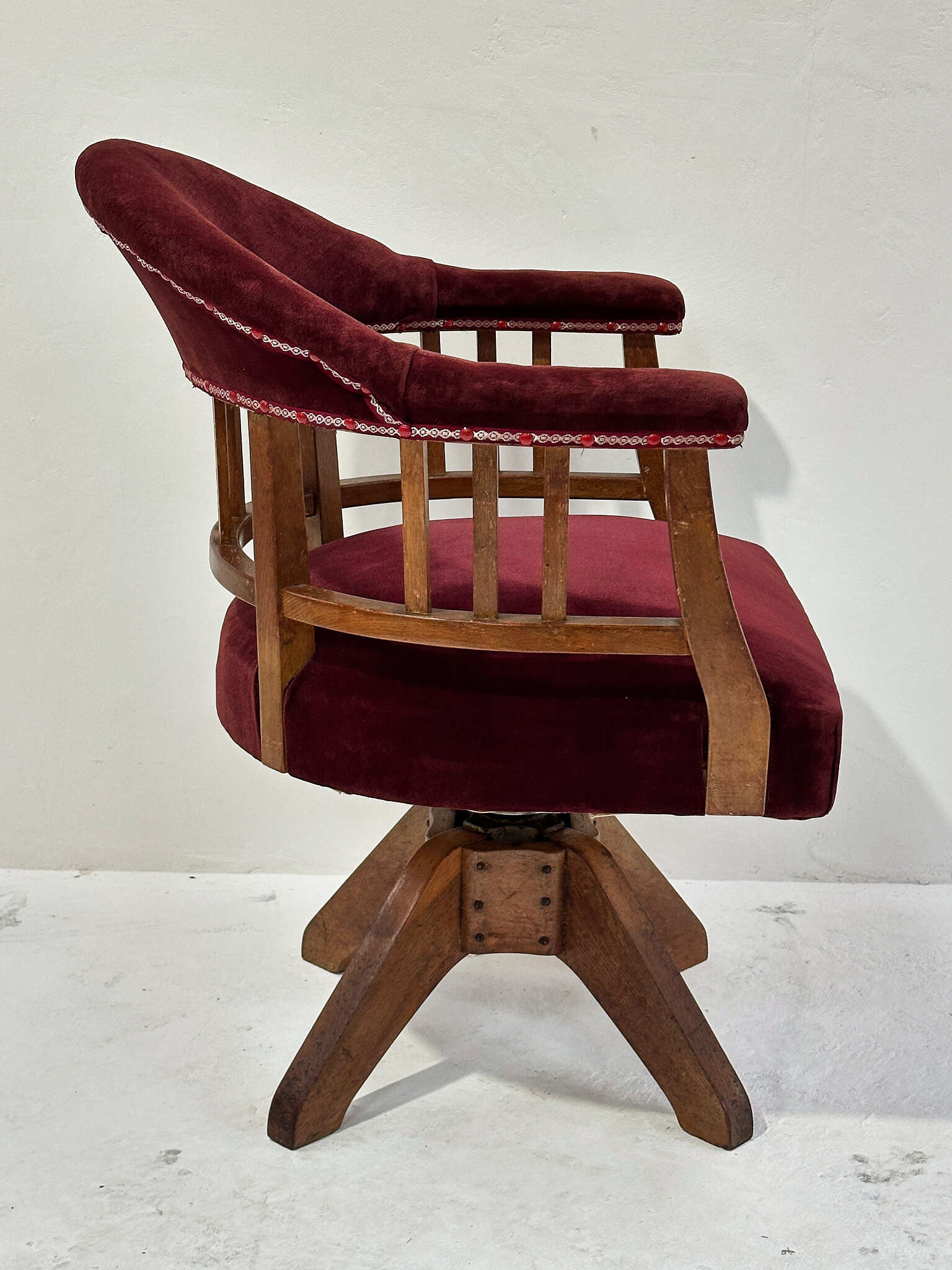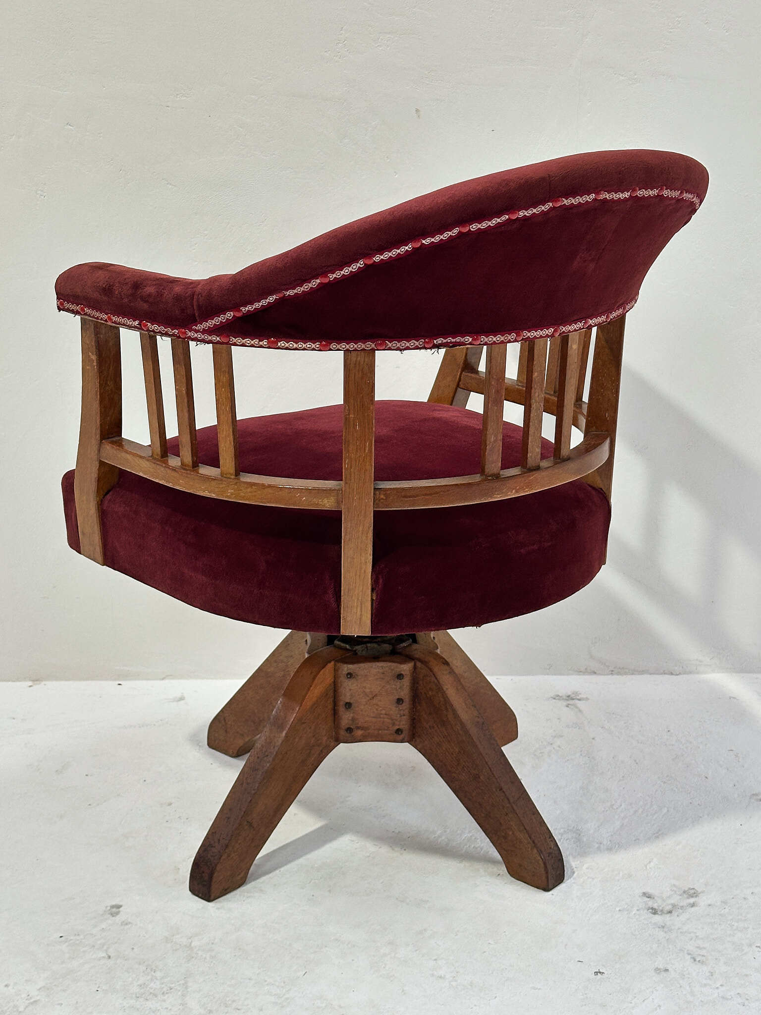 経年で深まった木部の艶と、生地の柔らかな質感が心地よく、書斎や店舗の雰囲気づくりにもおすすめの一脚です。
