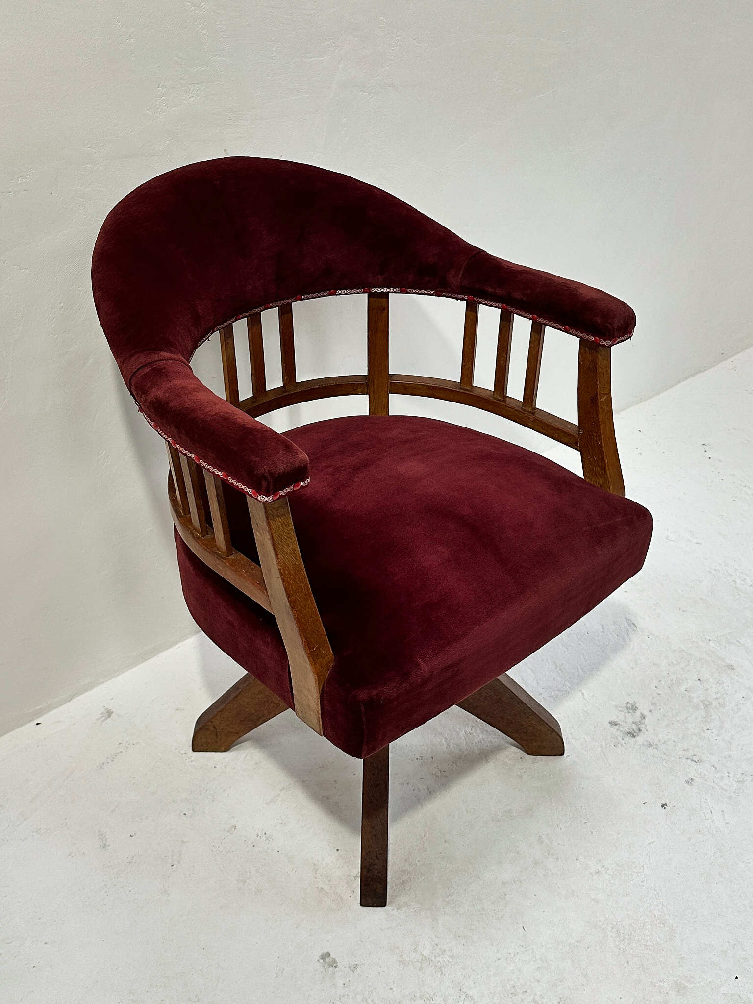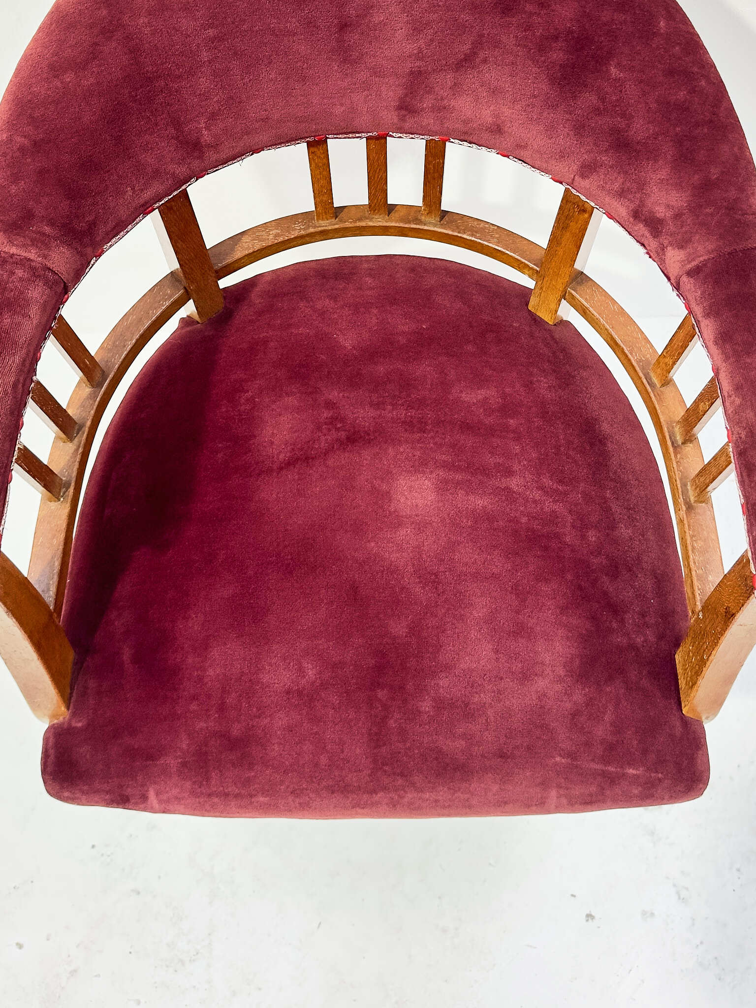 落ち着いたワインレッドのベルベット生地と無垢材のフレームのコントラストが印象的。