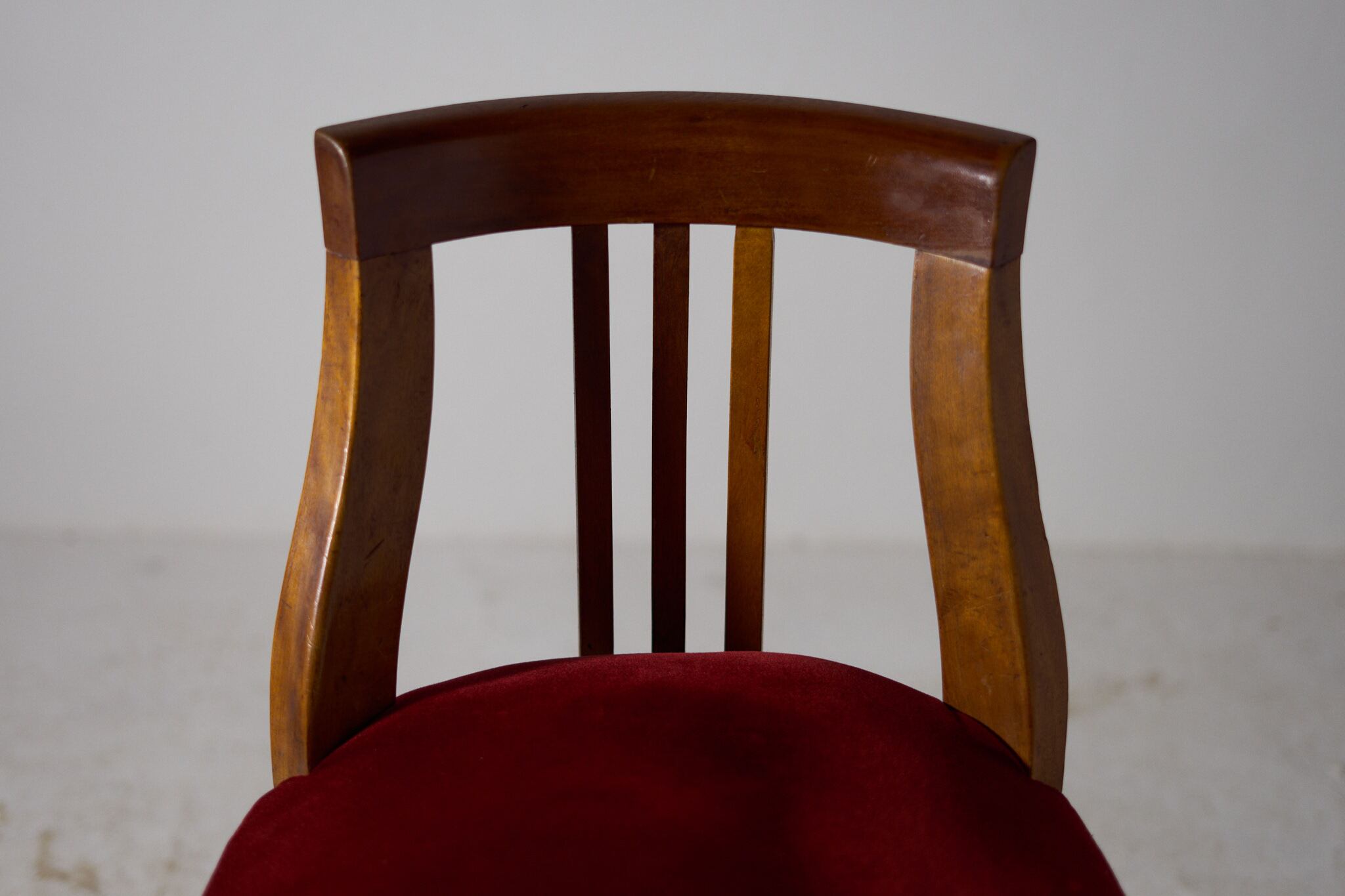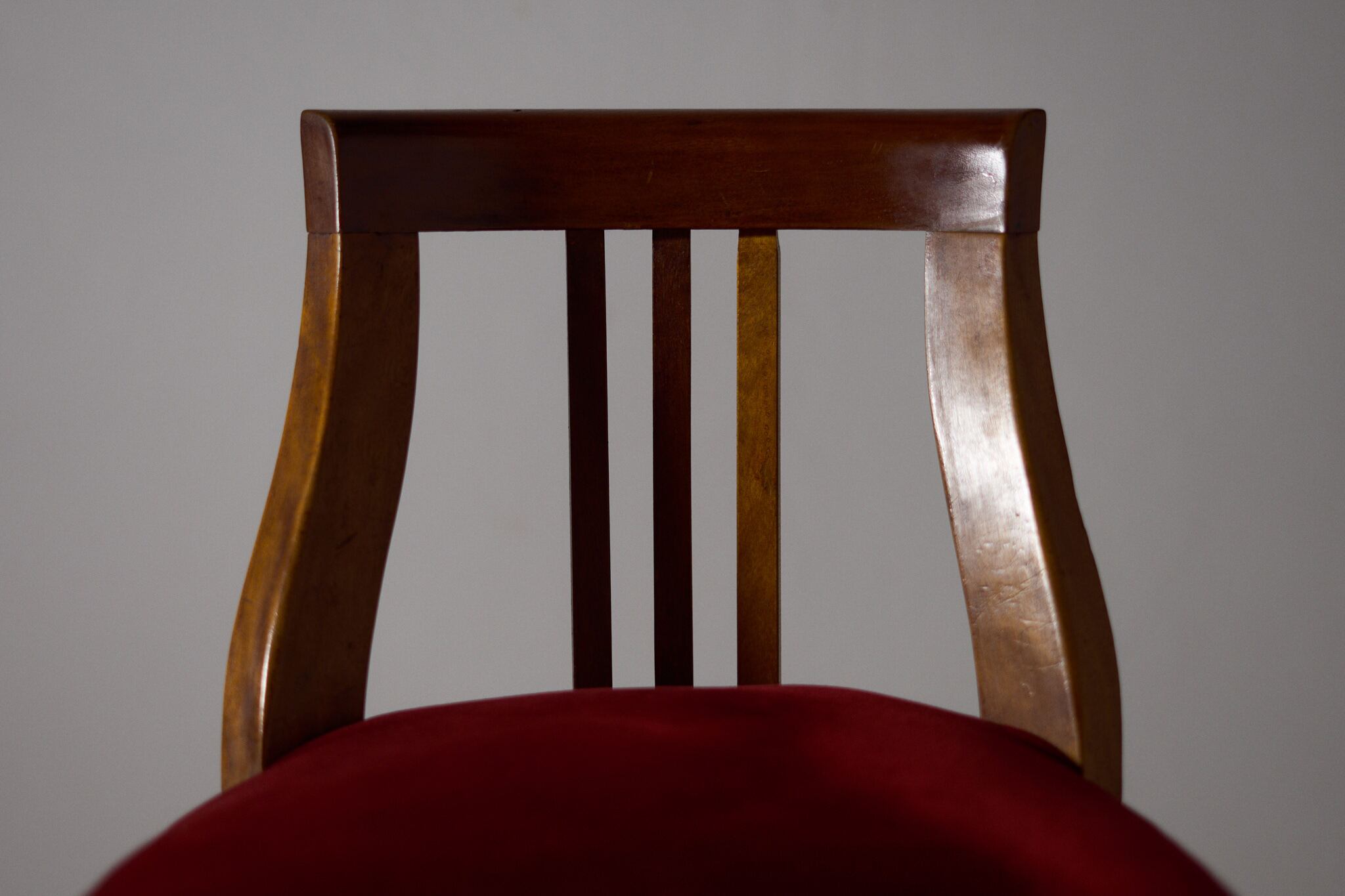 深紅のベルベットが無垢材の艶を引き締める。