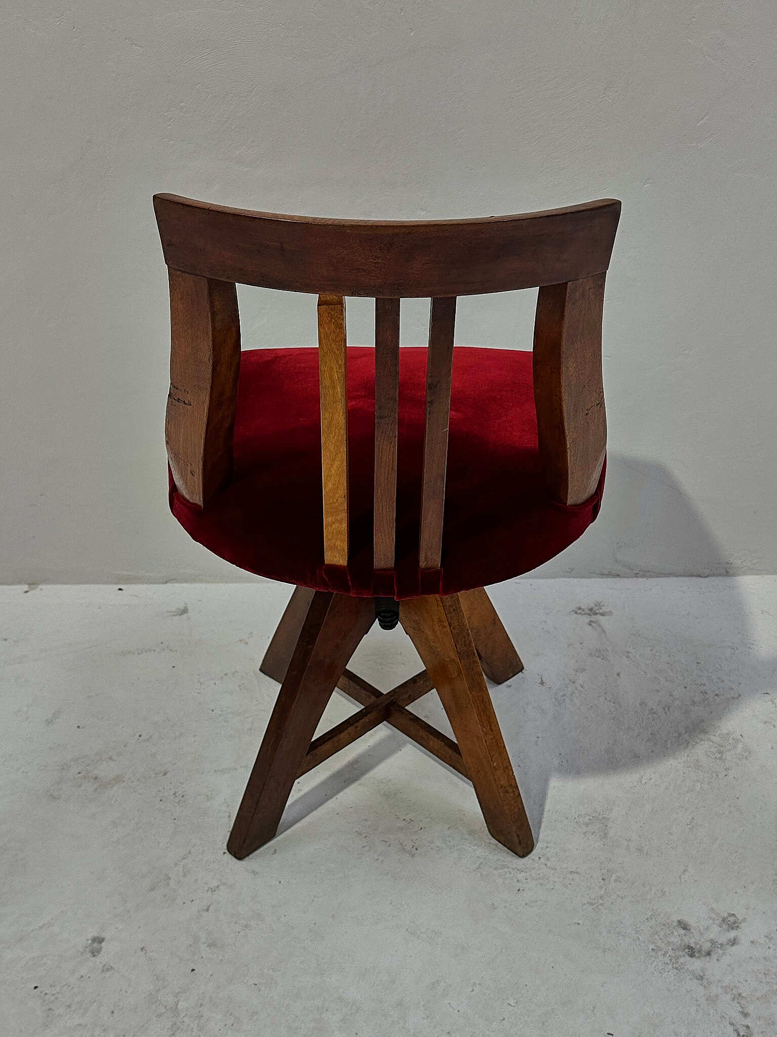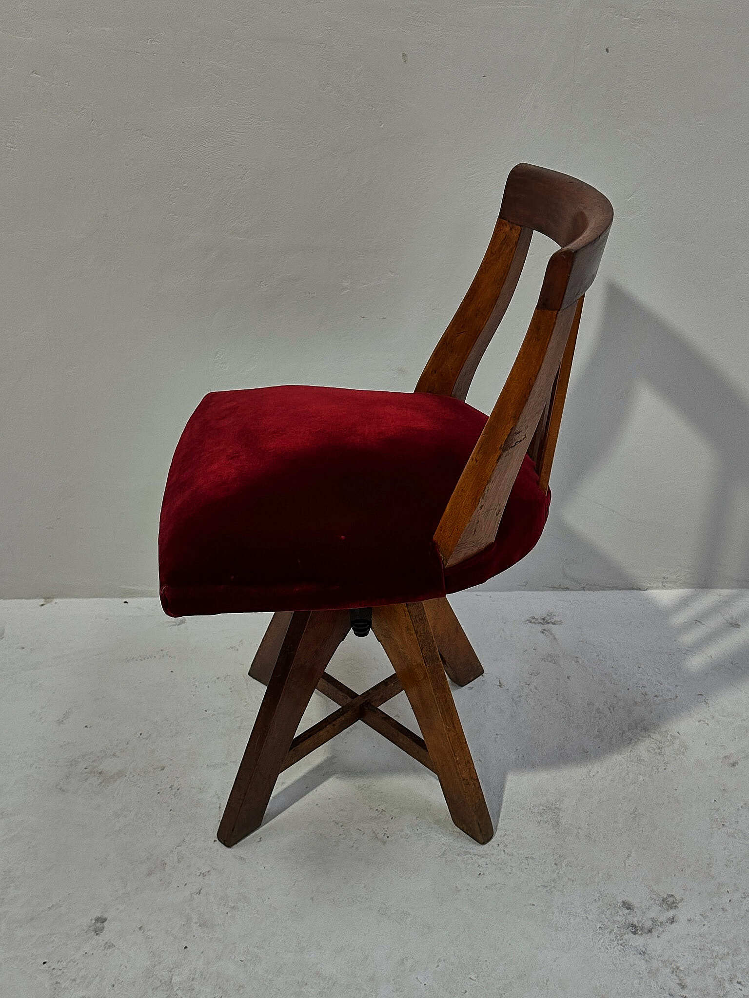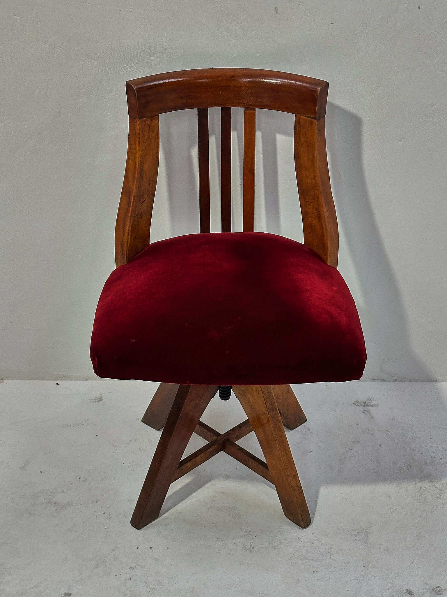 深紅のベルベットが無垢材の艶を引き締めます。座面は回転し、下部スクリューで高さ調整が可能。