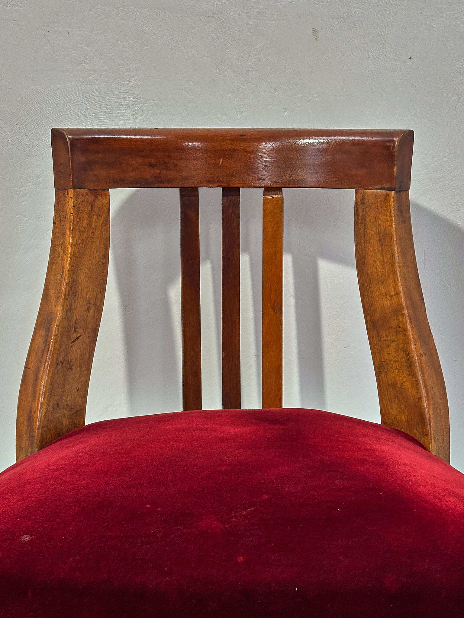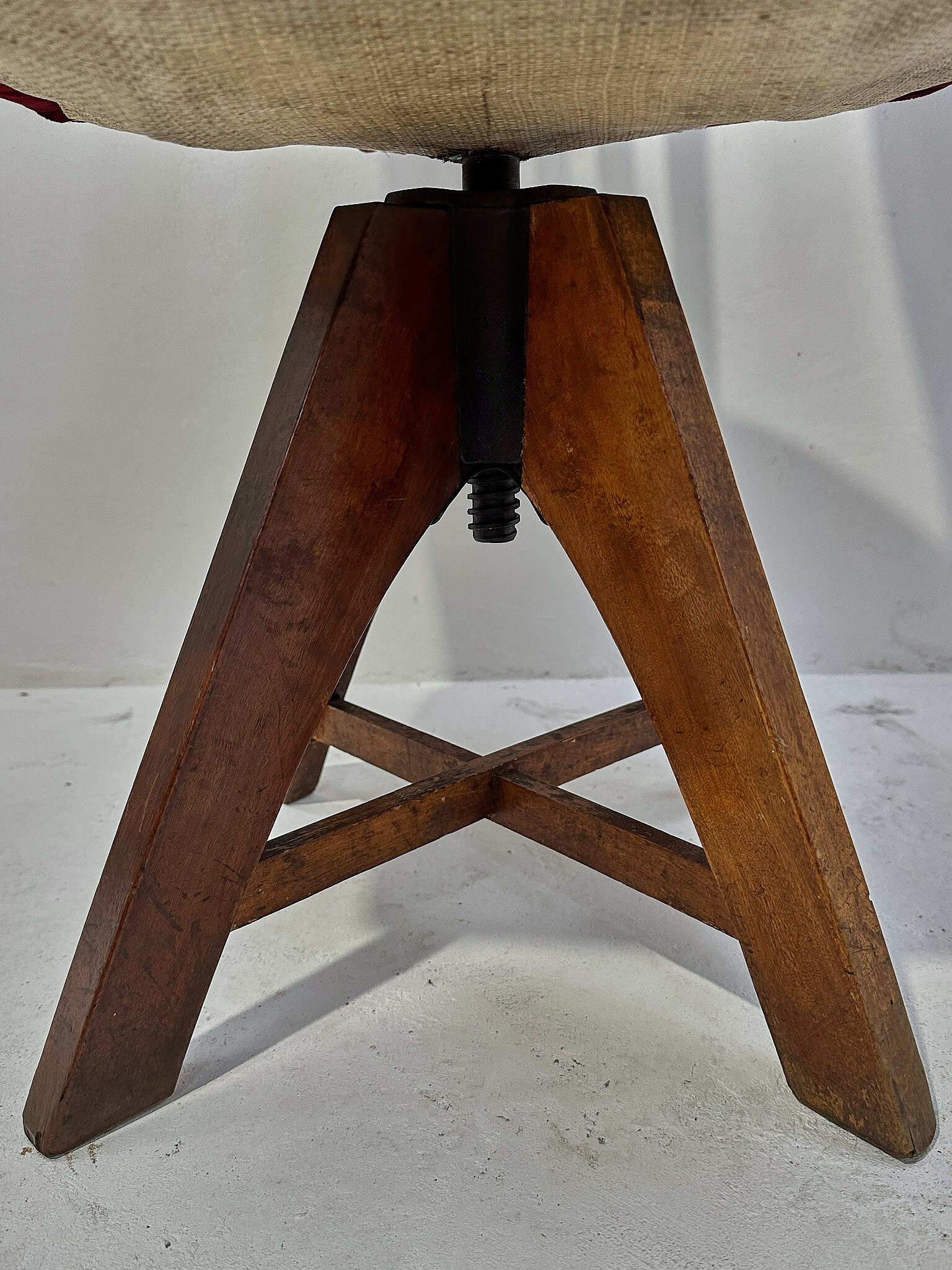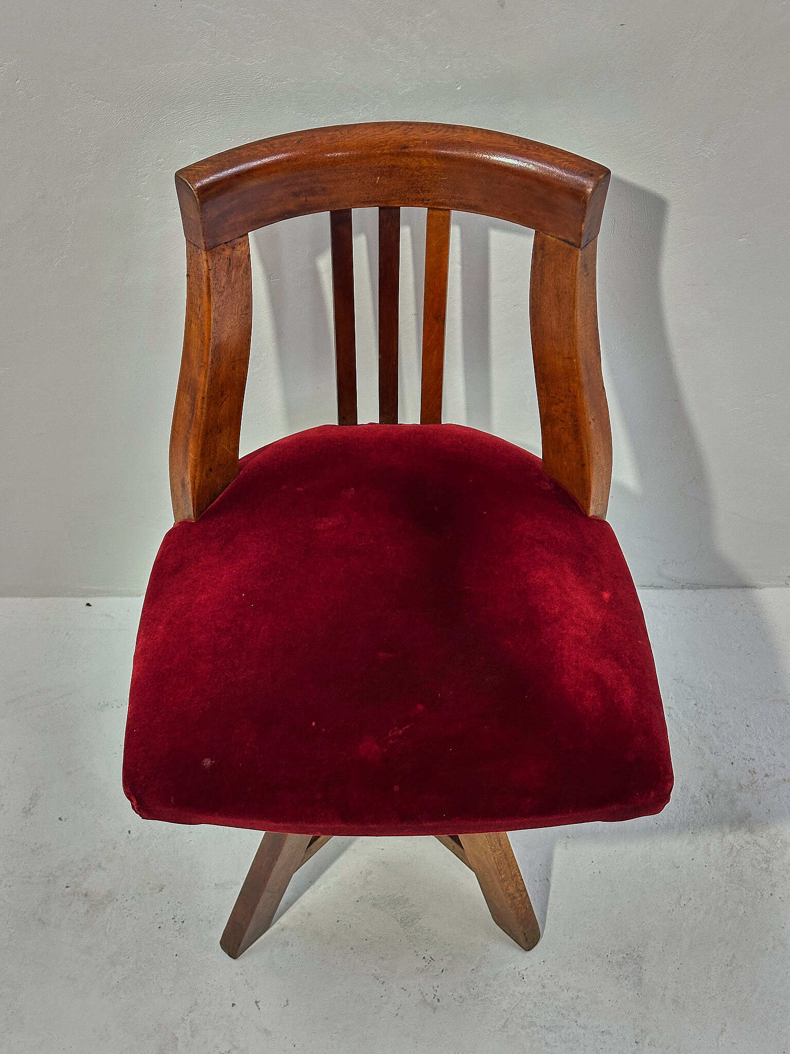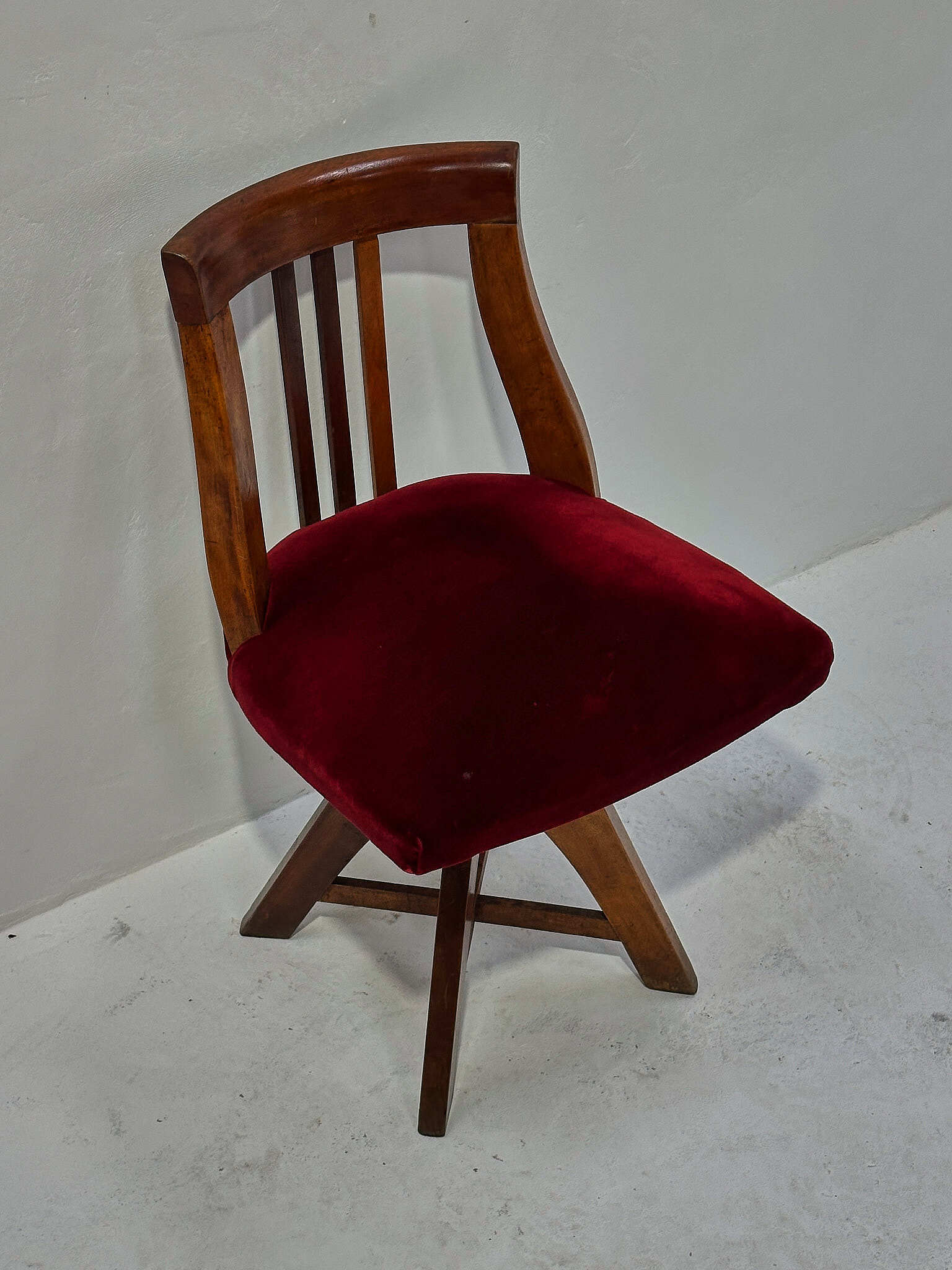 深紅のベルベットが無垢材の艶を引き締めます。座面は回転し、下部スクリューで高さ調整が可能。