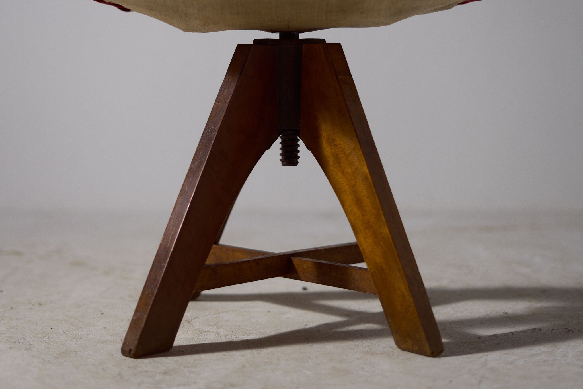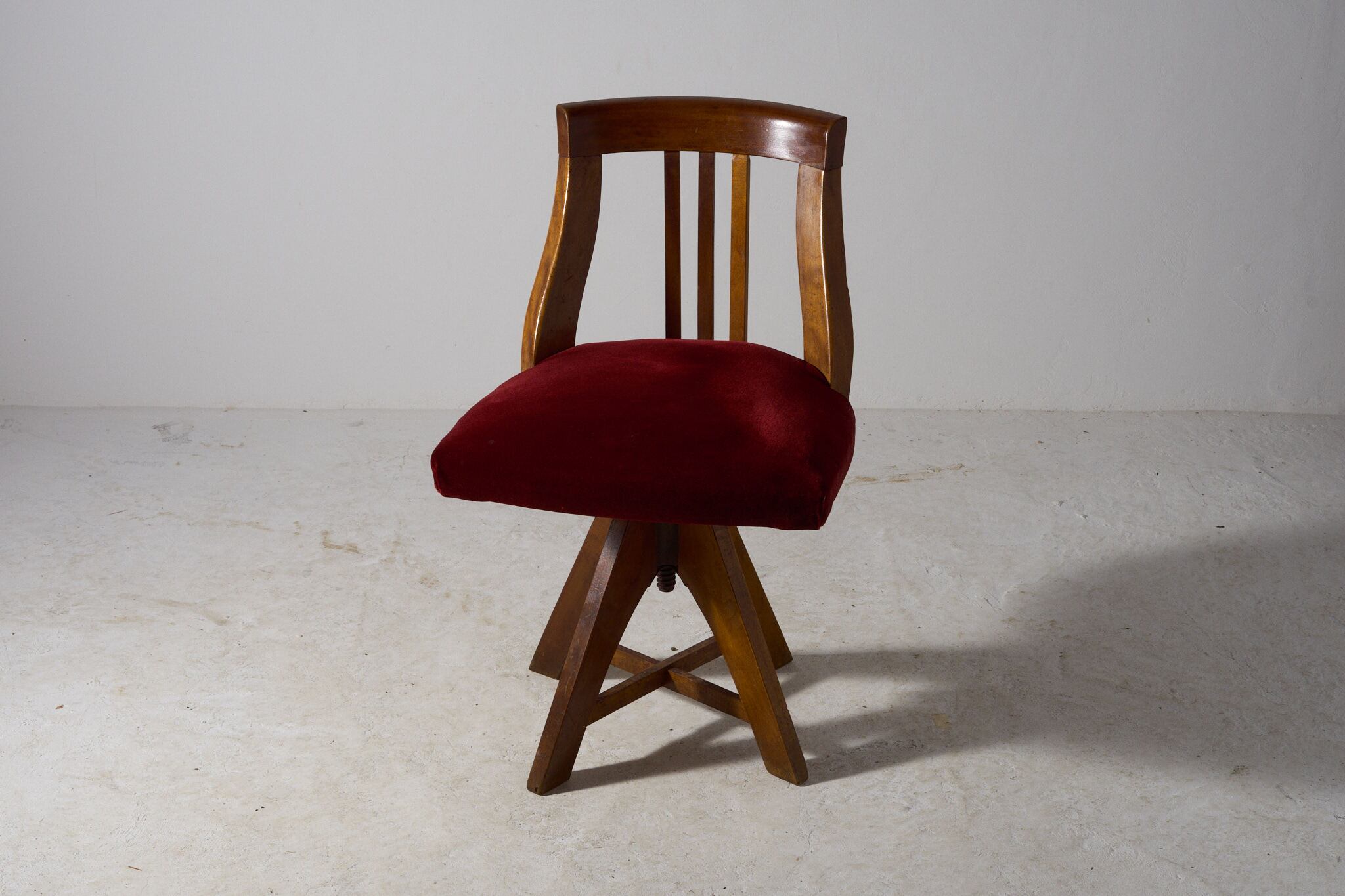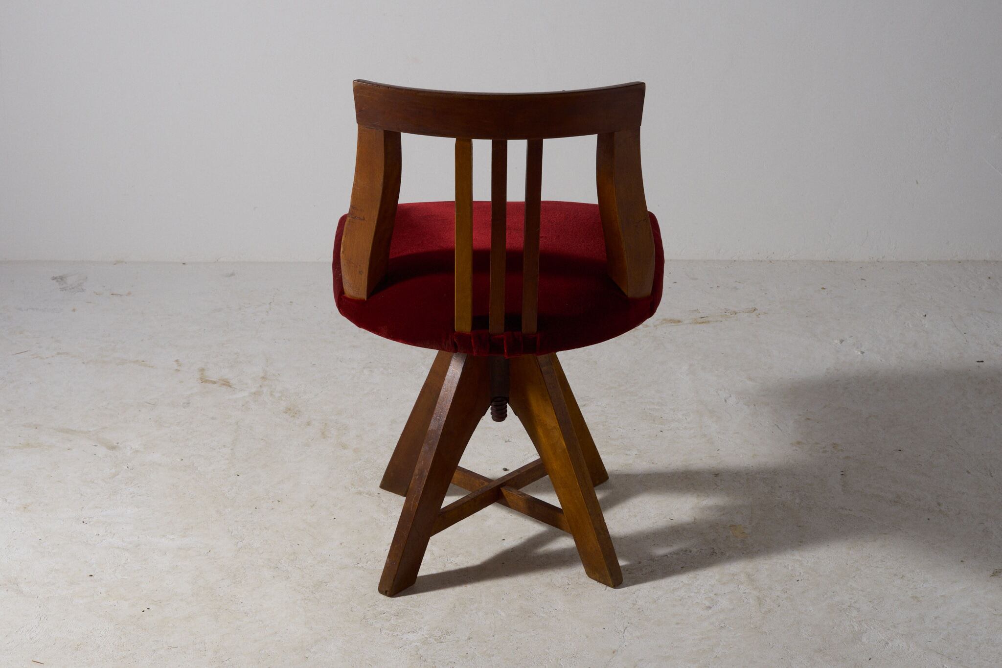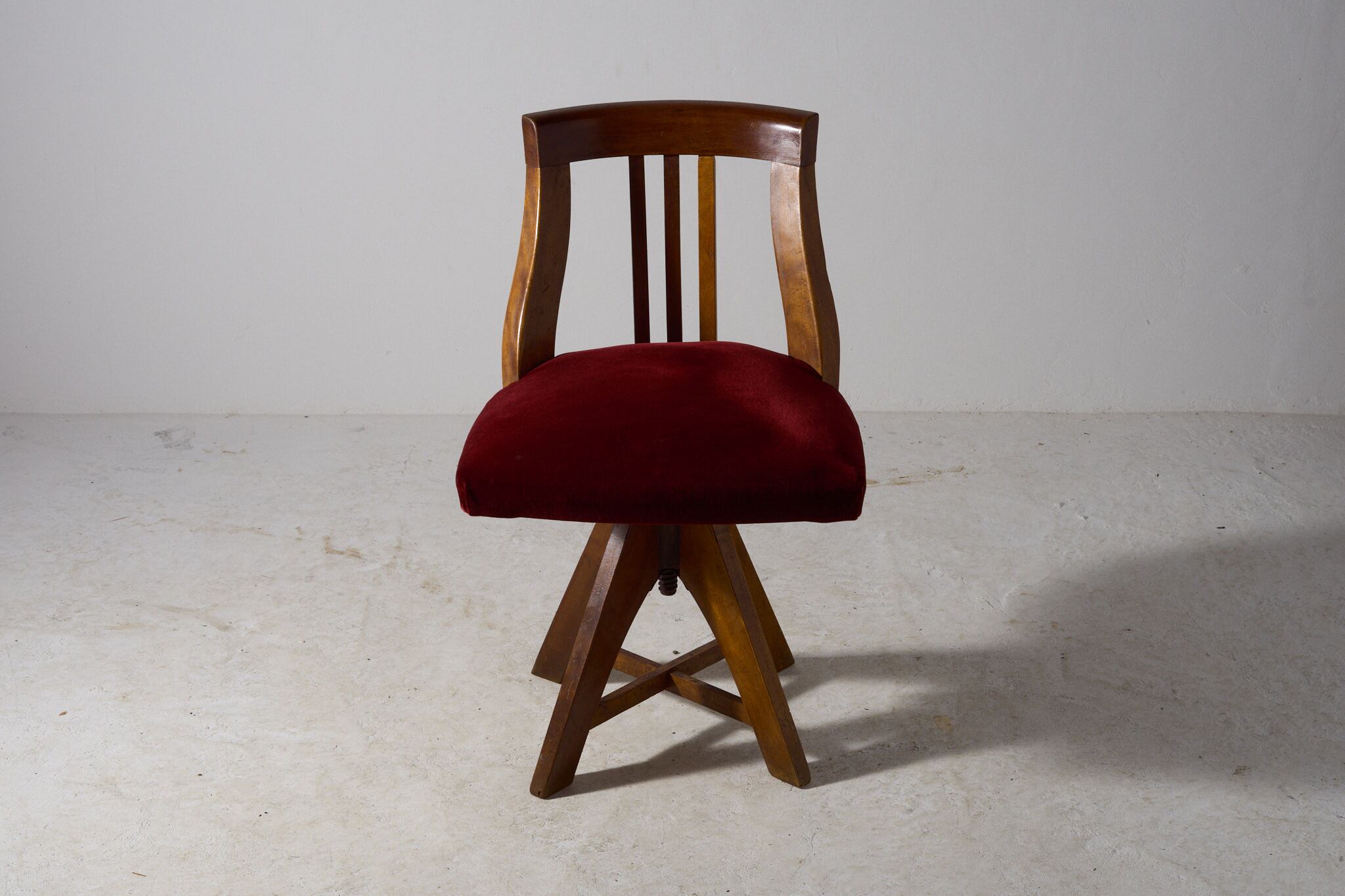 座面は回転し、下部のスクリューで高さ調整が可能。四方に開いた脚が安定感を生み、デスク脇やドレッサー前、店舗の接客にも扱いやすいサイズ感。大正から昭和初期にかけて、事務所や商家で使われていたであろう回転椅子。時を経た無垢材の艶と、深い赤が静かな存在感を放つ。