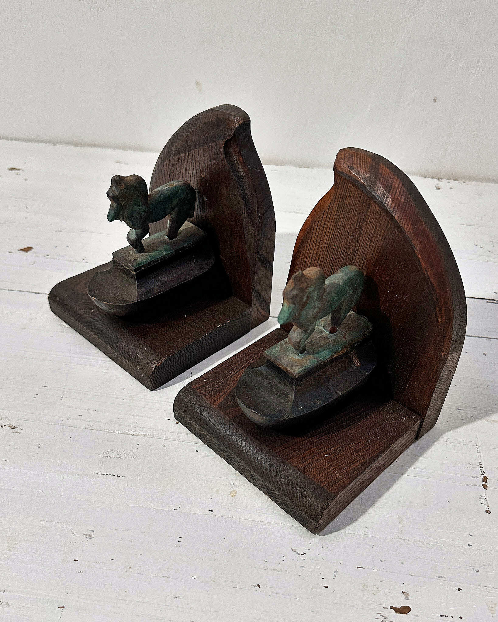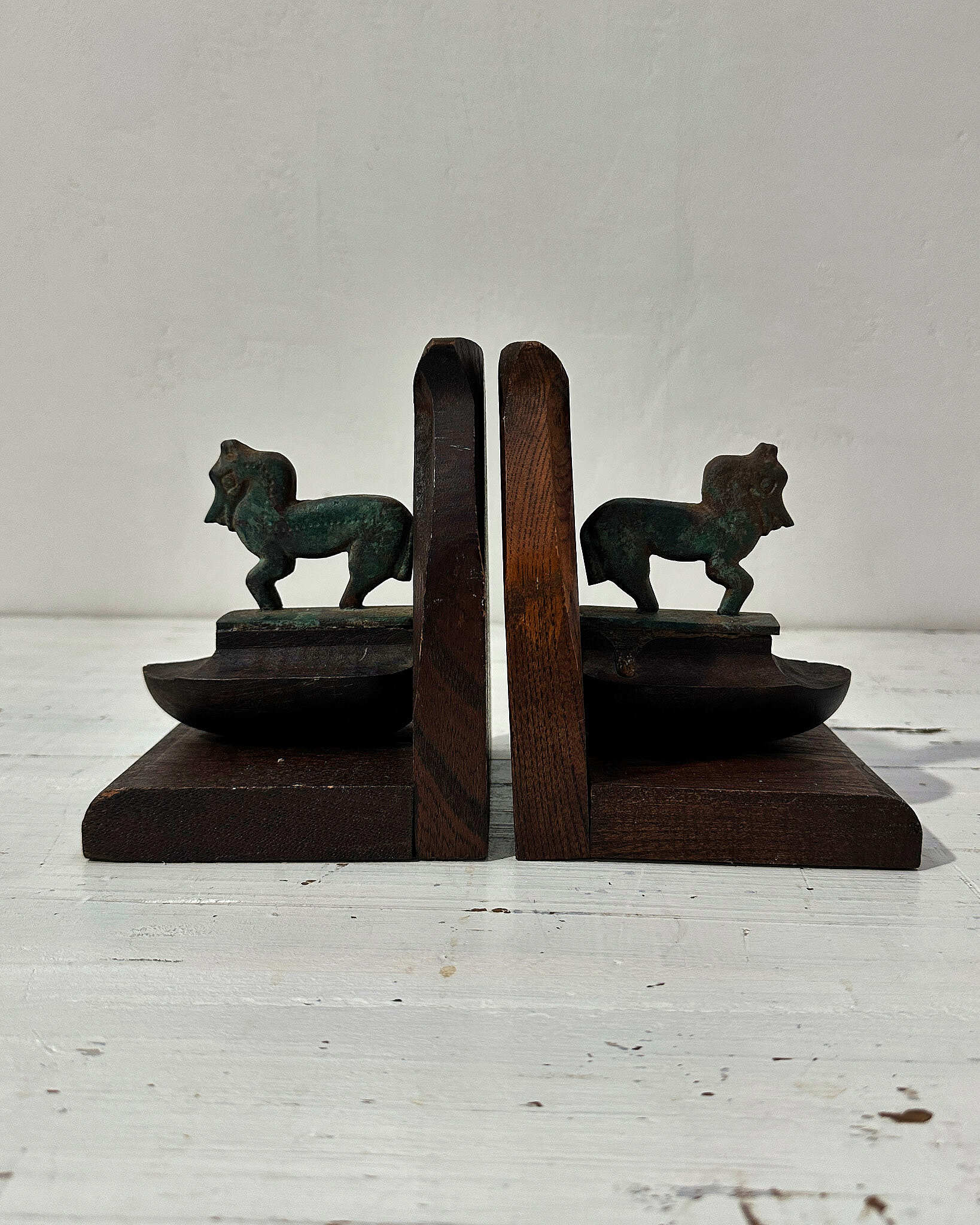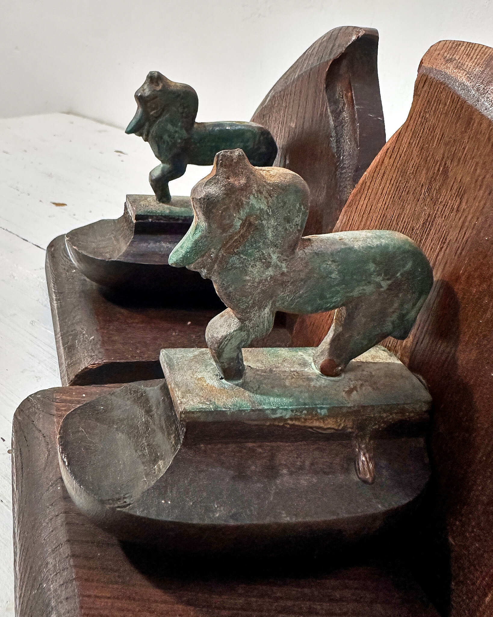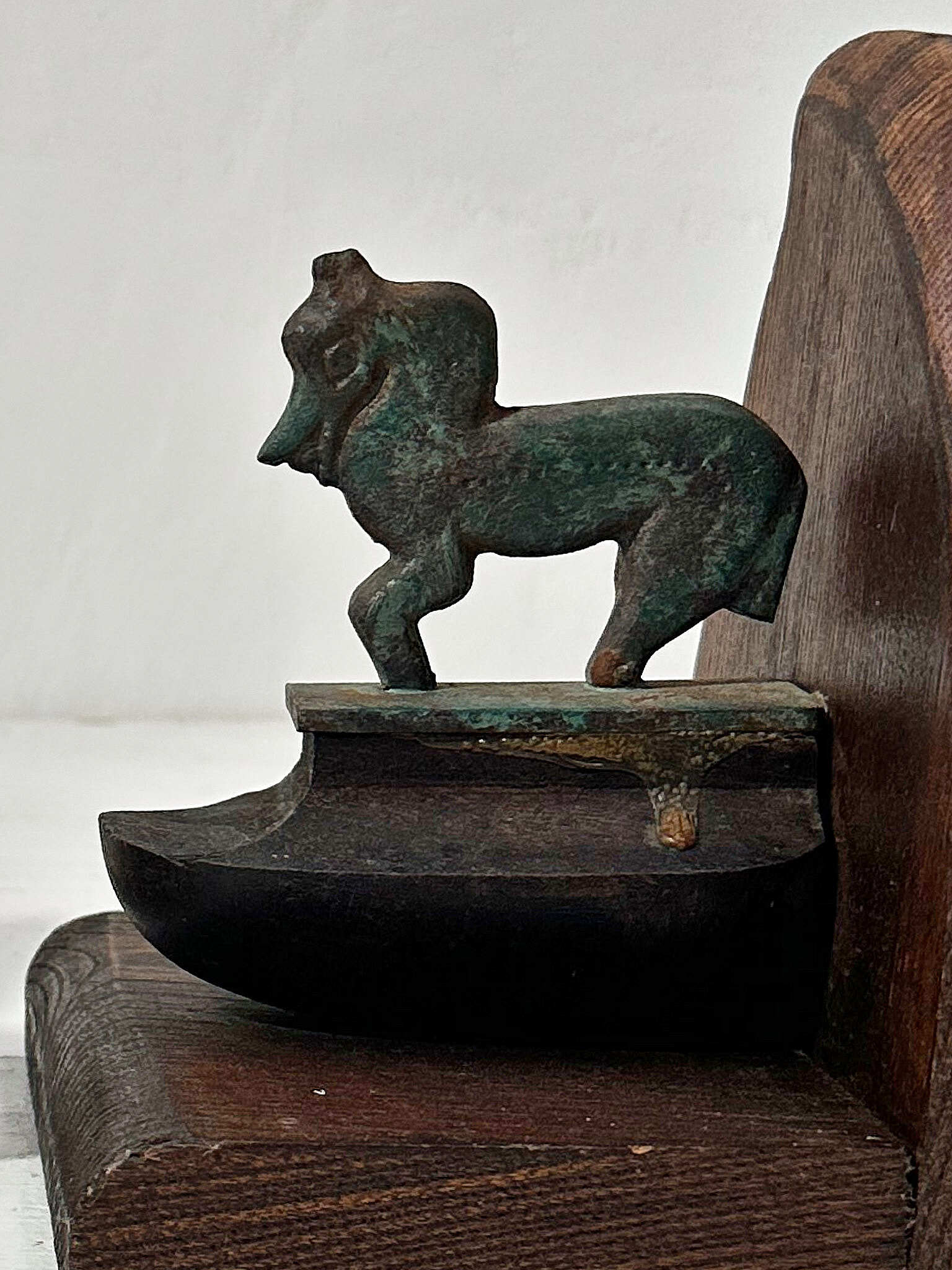 黒褐色の木台に、緑青をまとったお馬さんの金属小像。