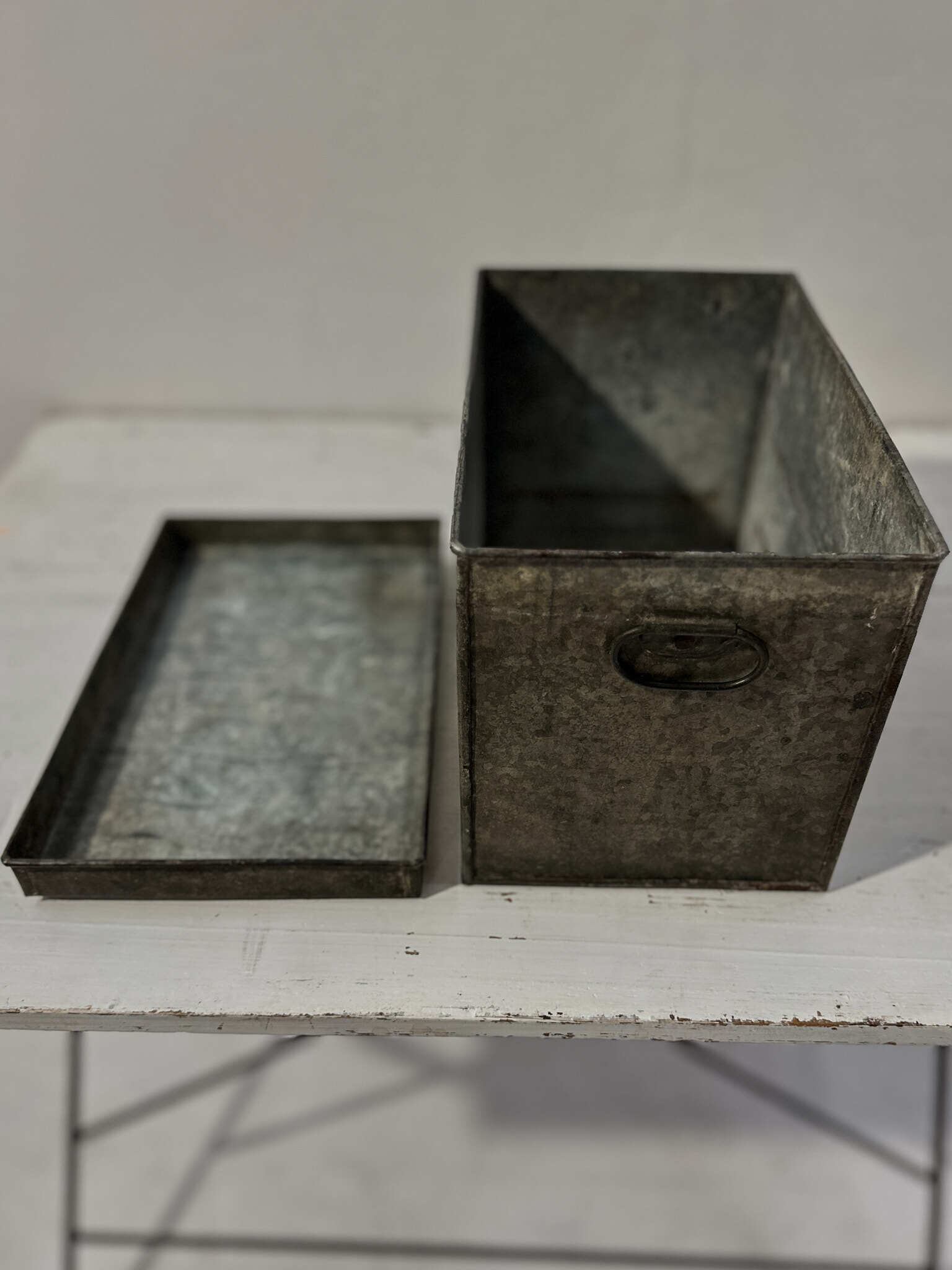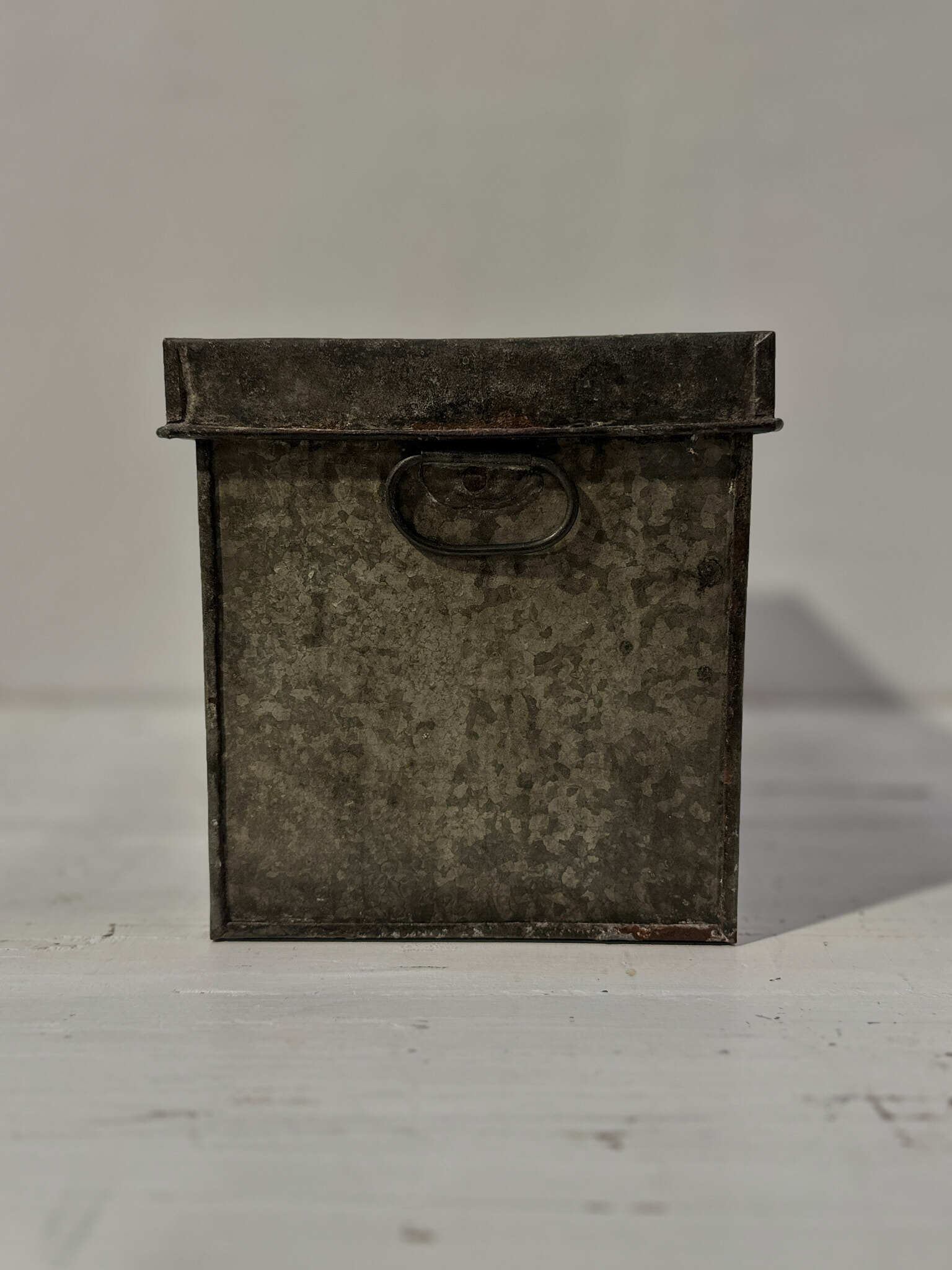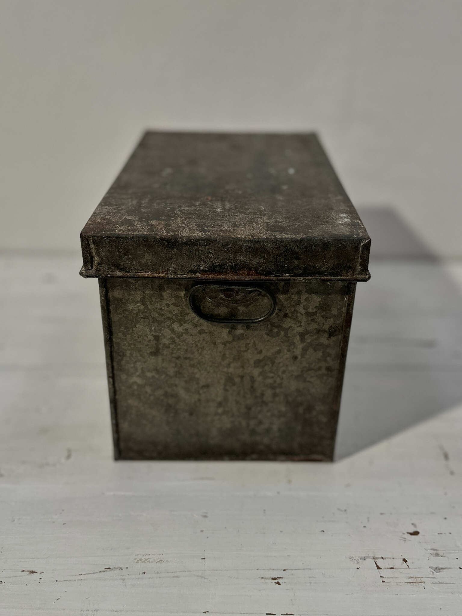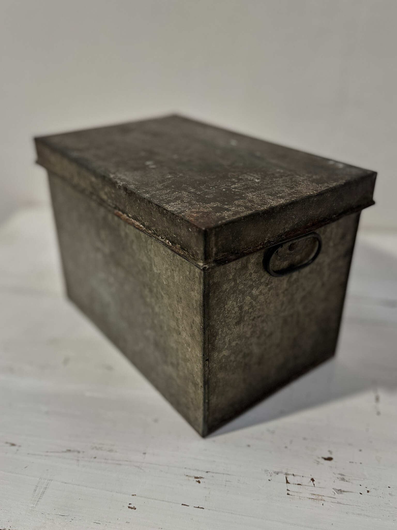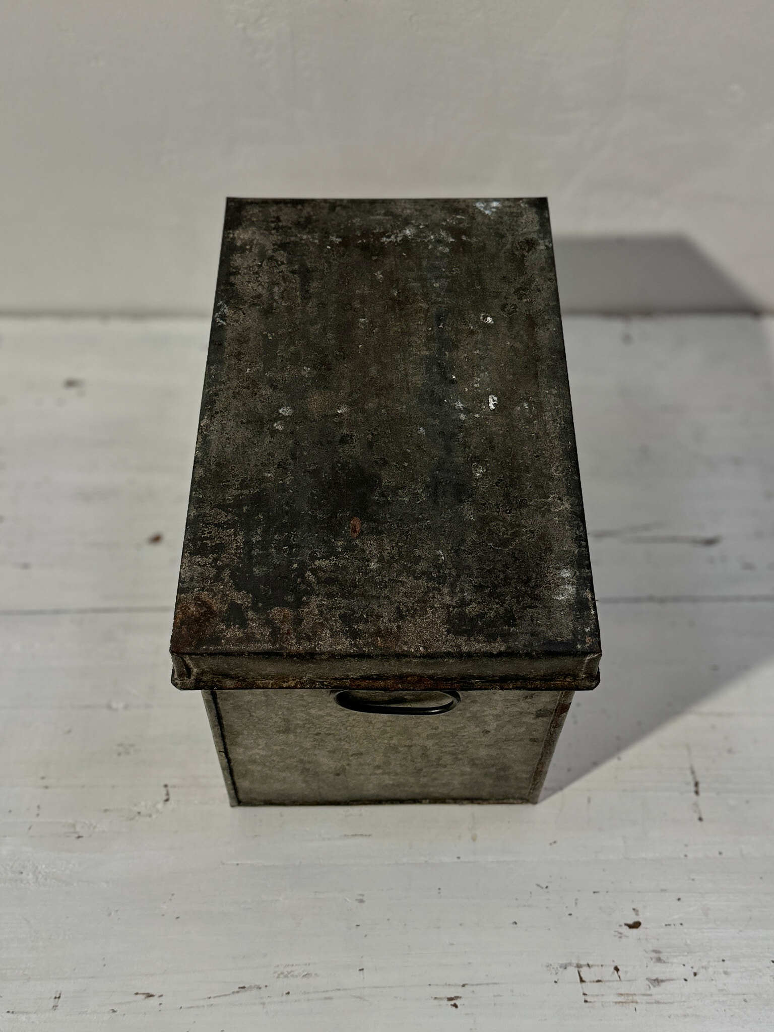 くすんだグレーのブリキに、時間の跡がにじむふた付き箱。