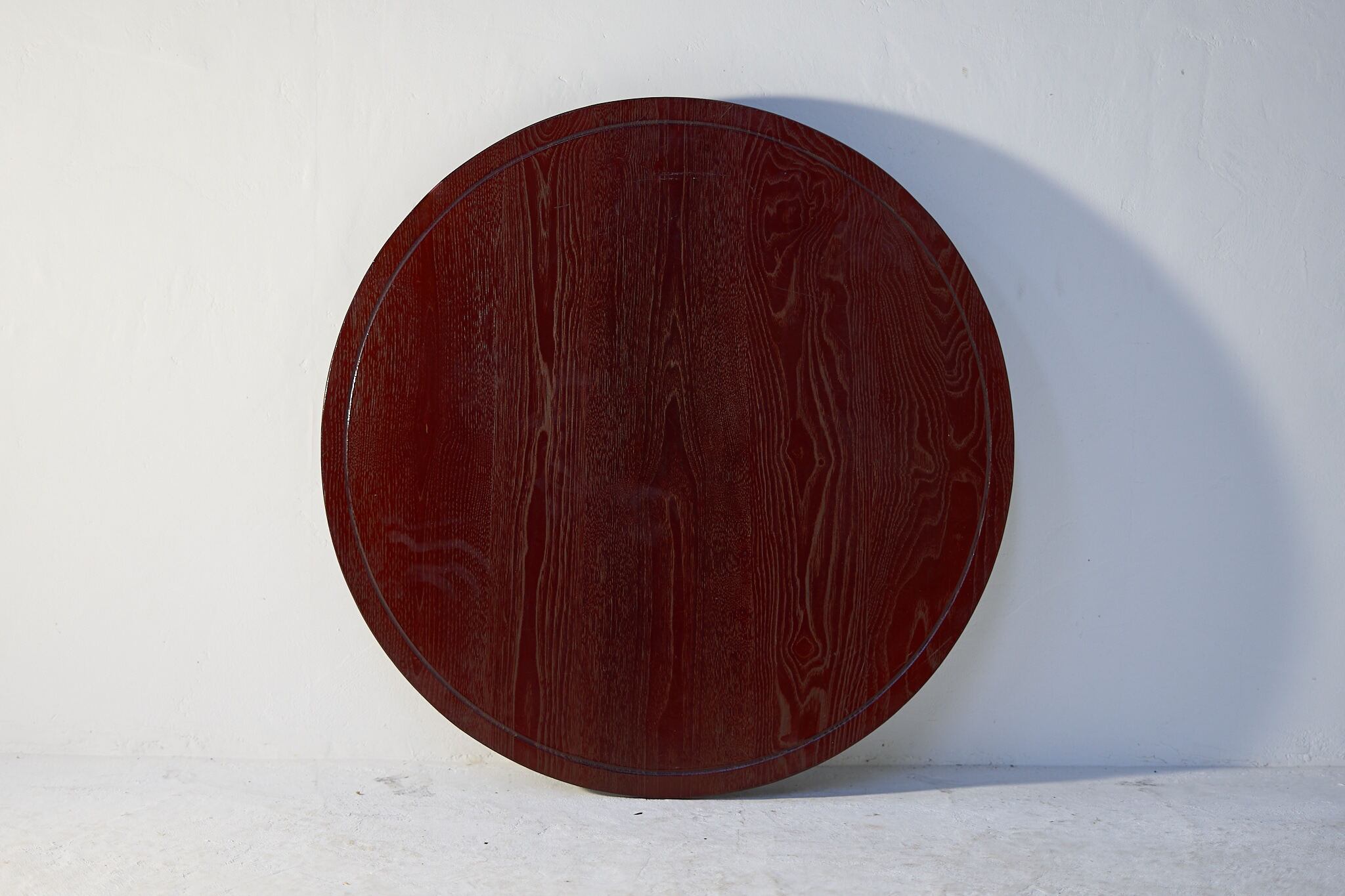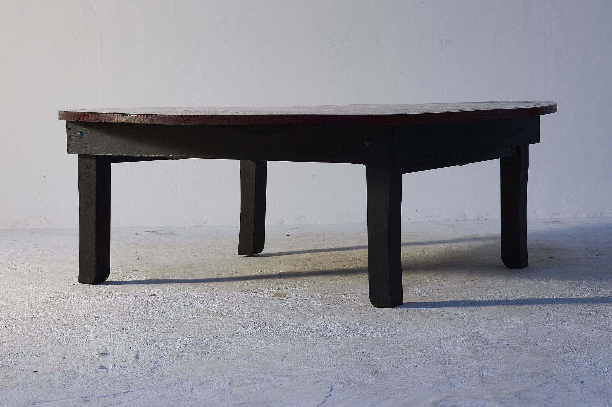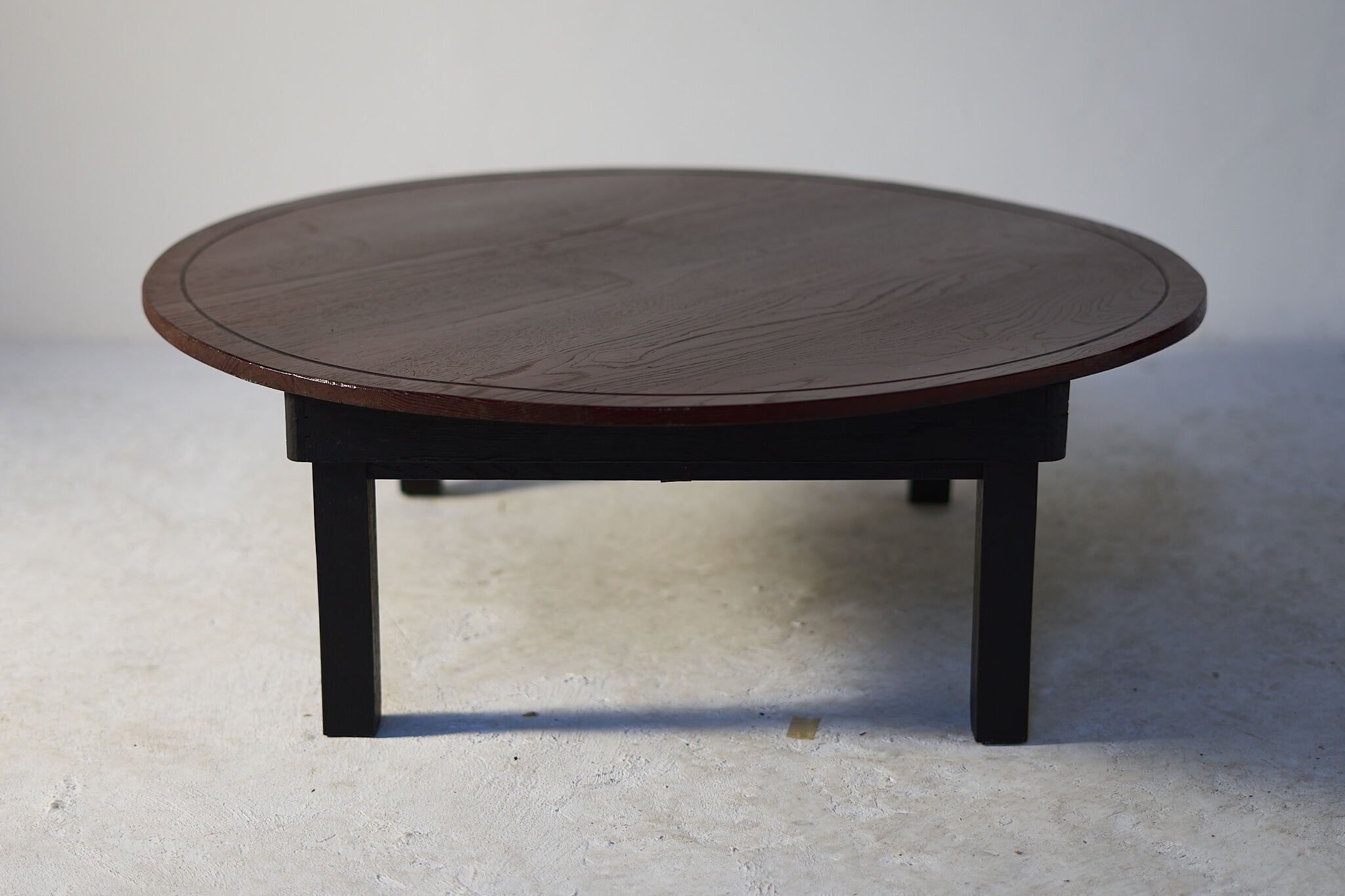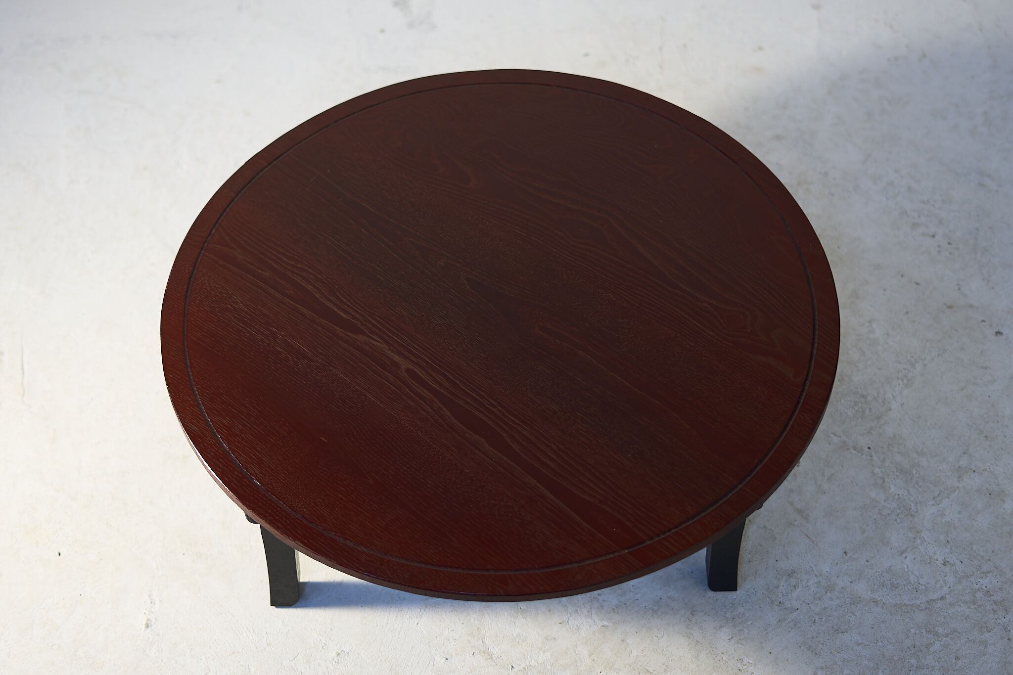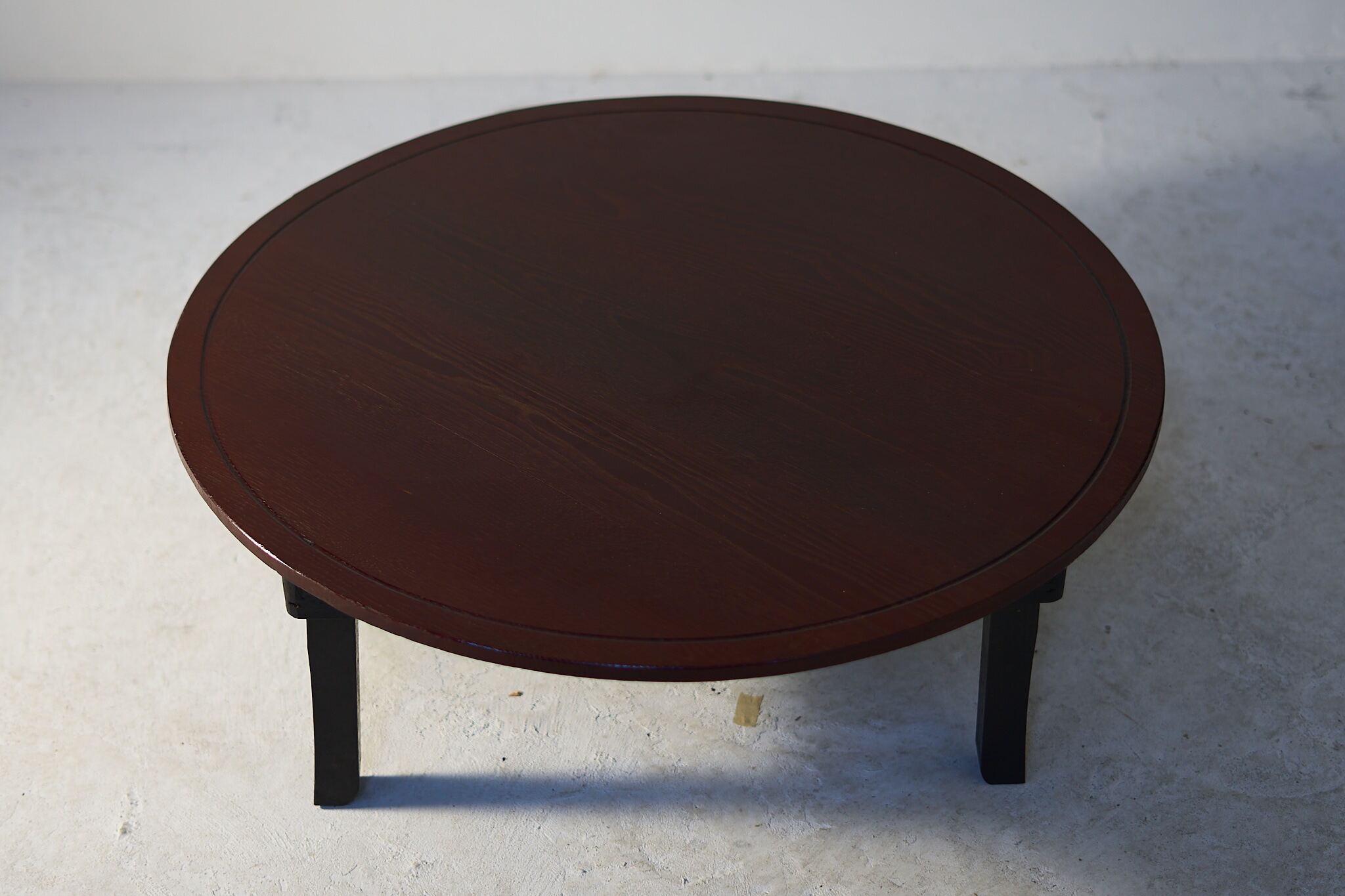 深い朱に木目がゆっくり浮かぶ、まあるい座卓。いわゆるちゃぶ台。