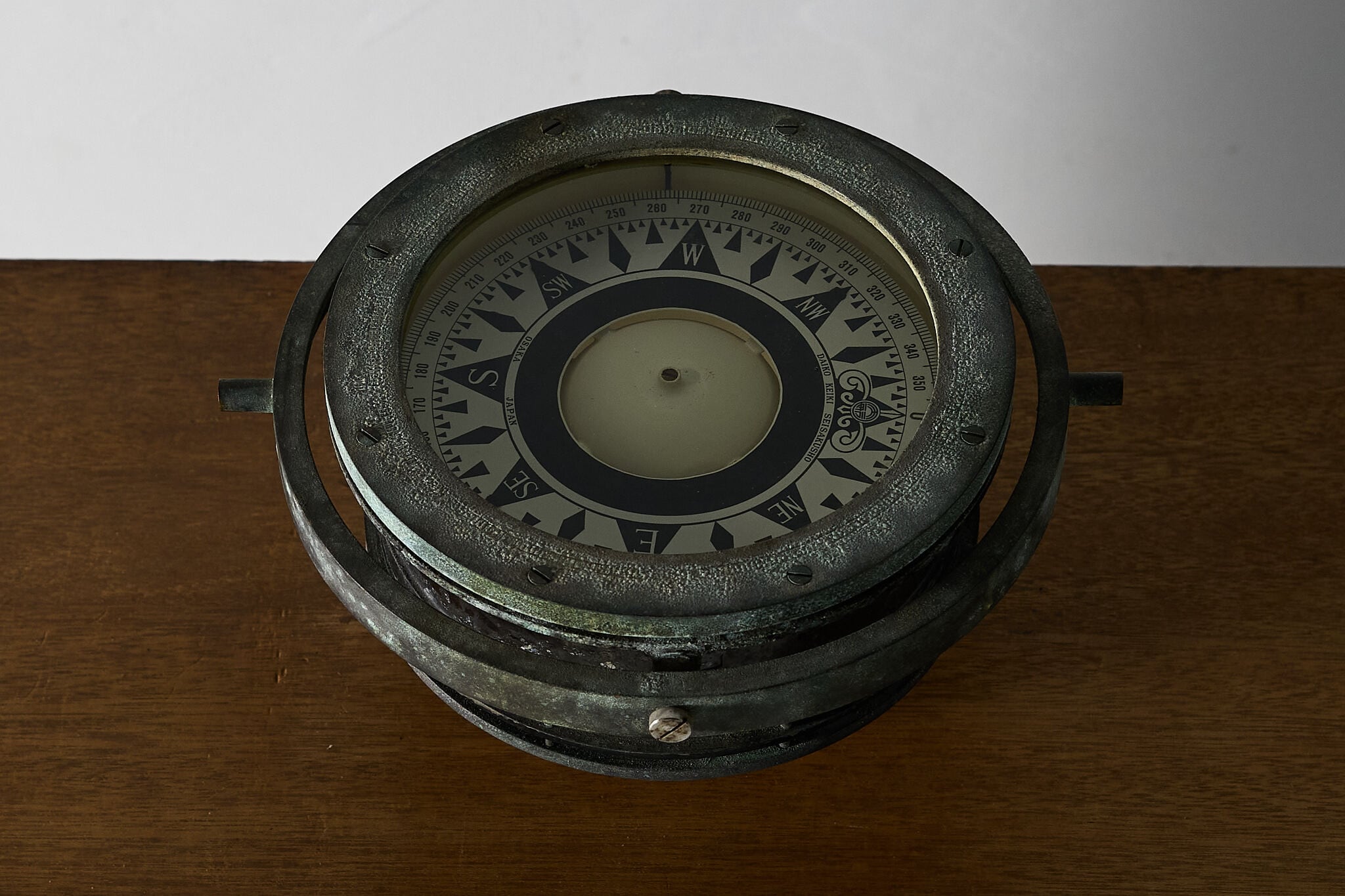 緑青を帯びた金属と図案化された方位盤が、静かな存在感をつくります。