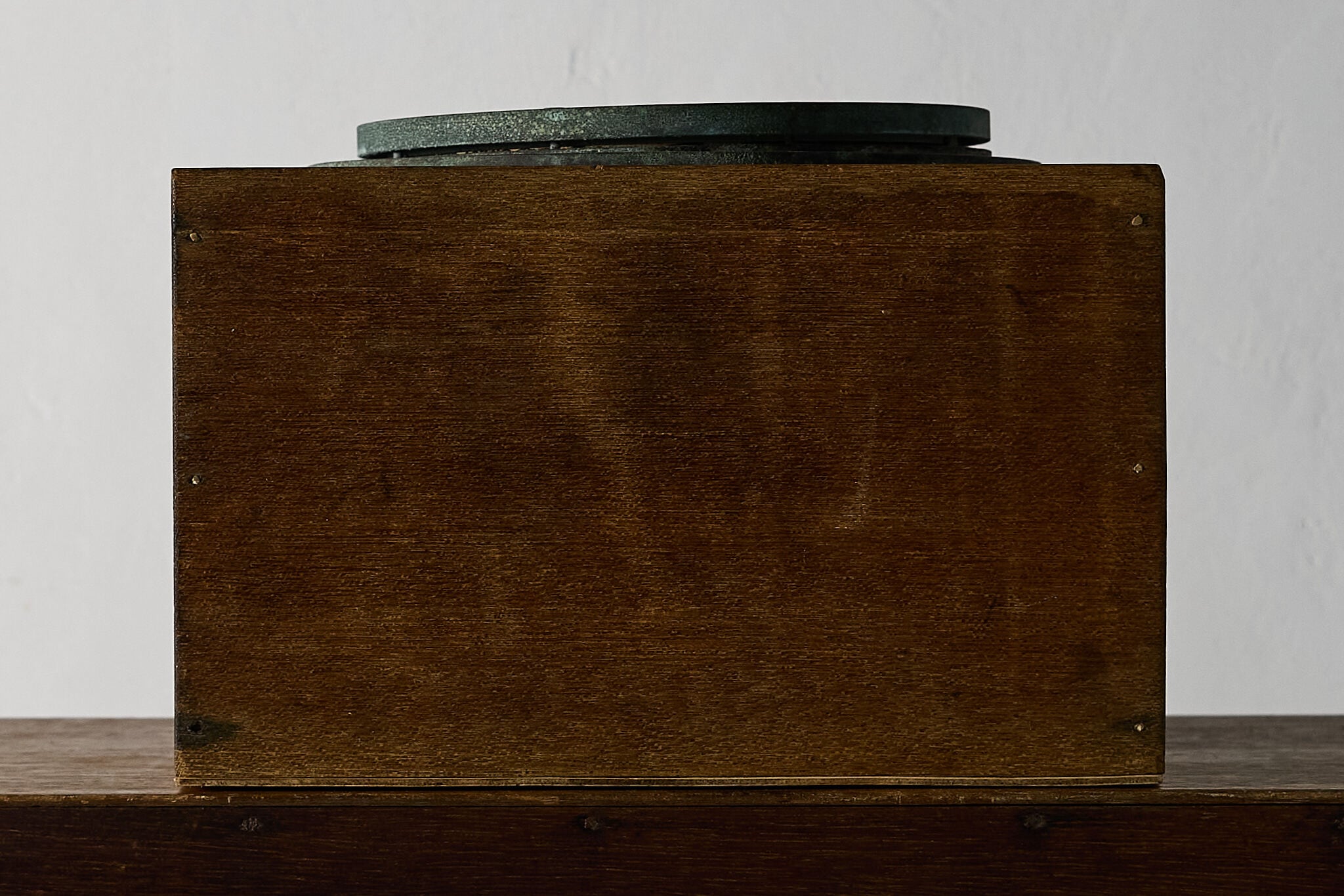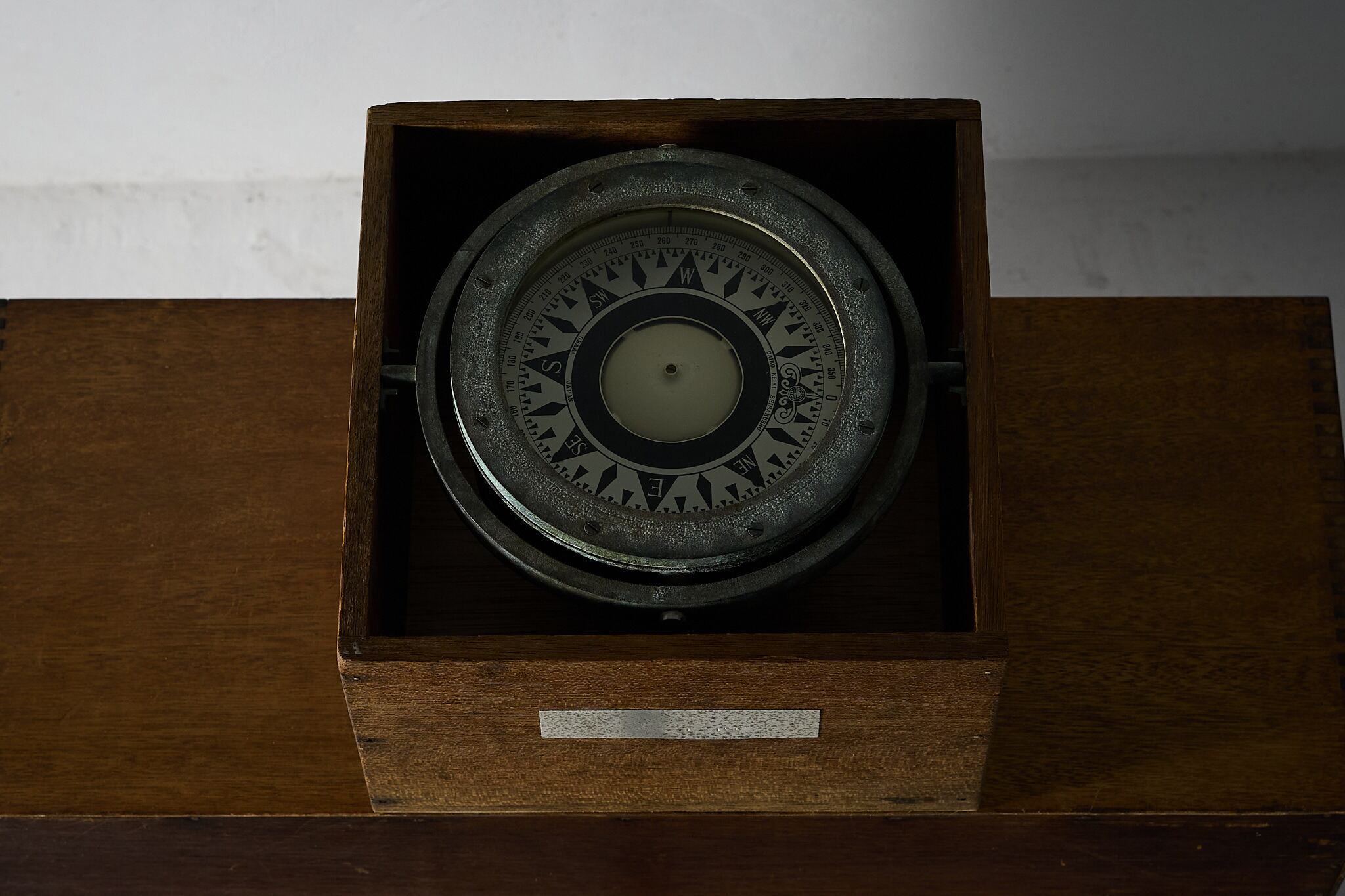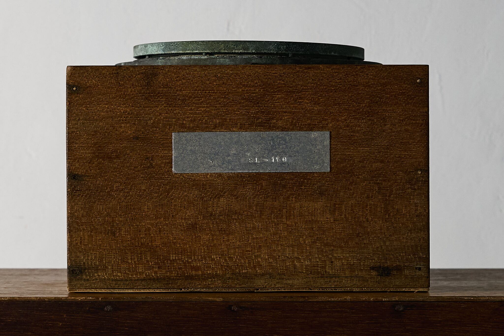 状態: 金属部に緑青・くすみ・小傷、方位盤にごく薄い汚れ、木箱に小さな当たりや色ムラがあります。蓋は付属しません。現状での観賞・ディスプレイ利用に適します。