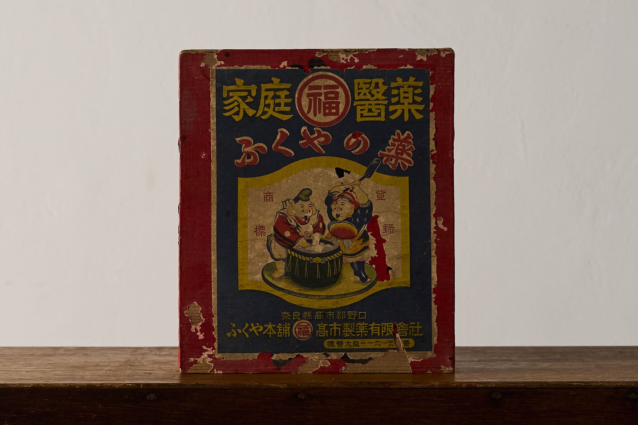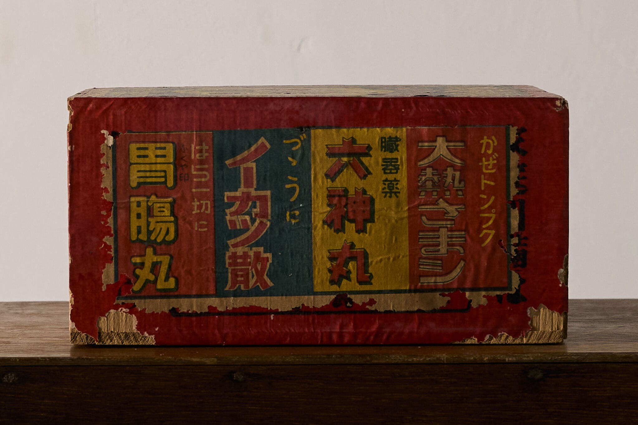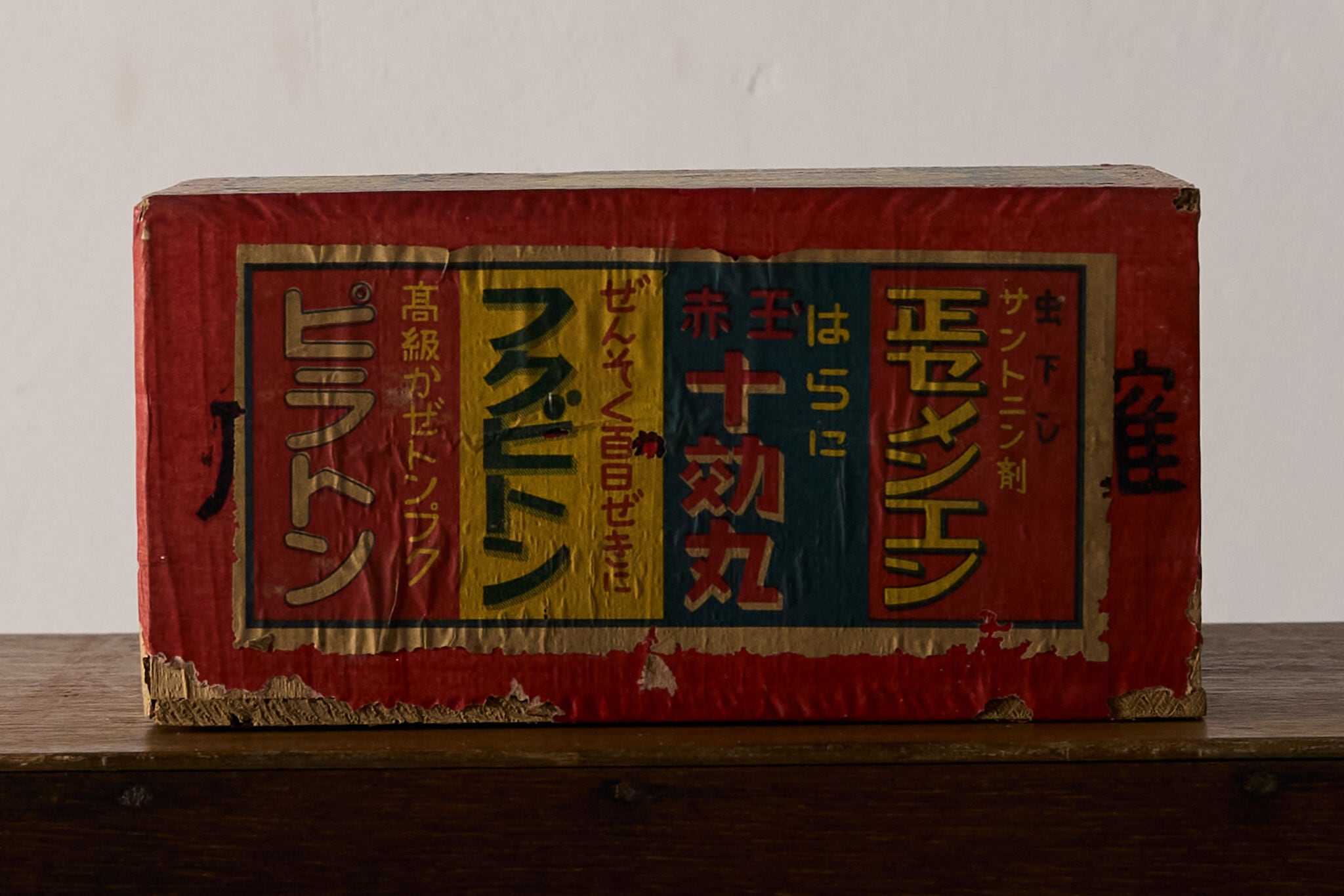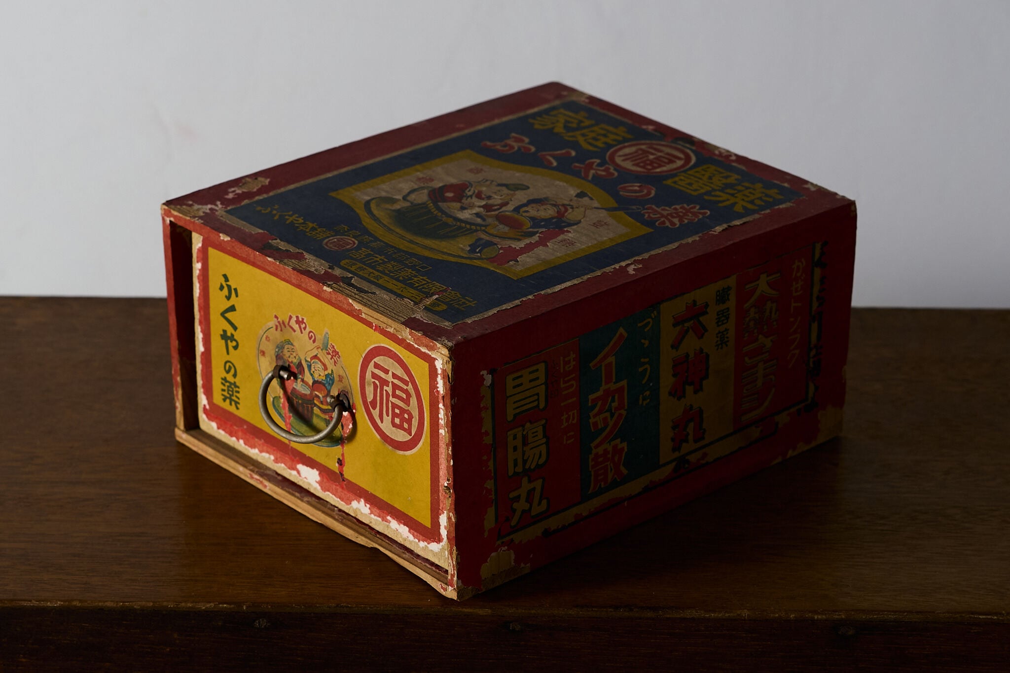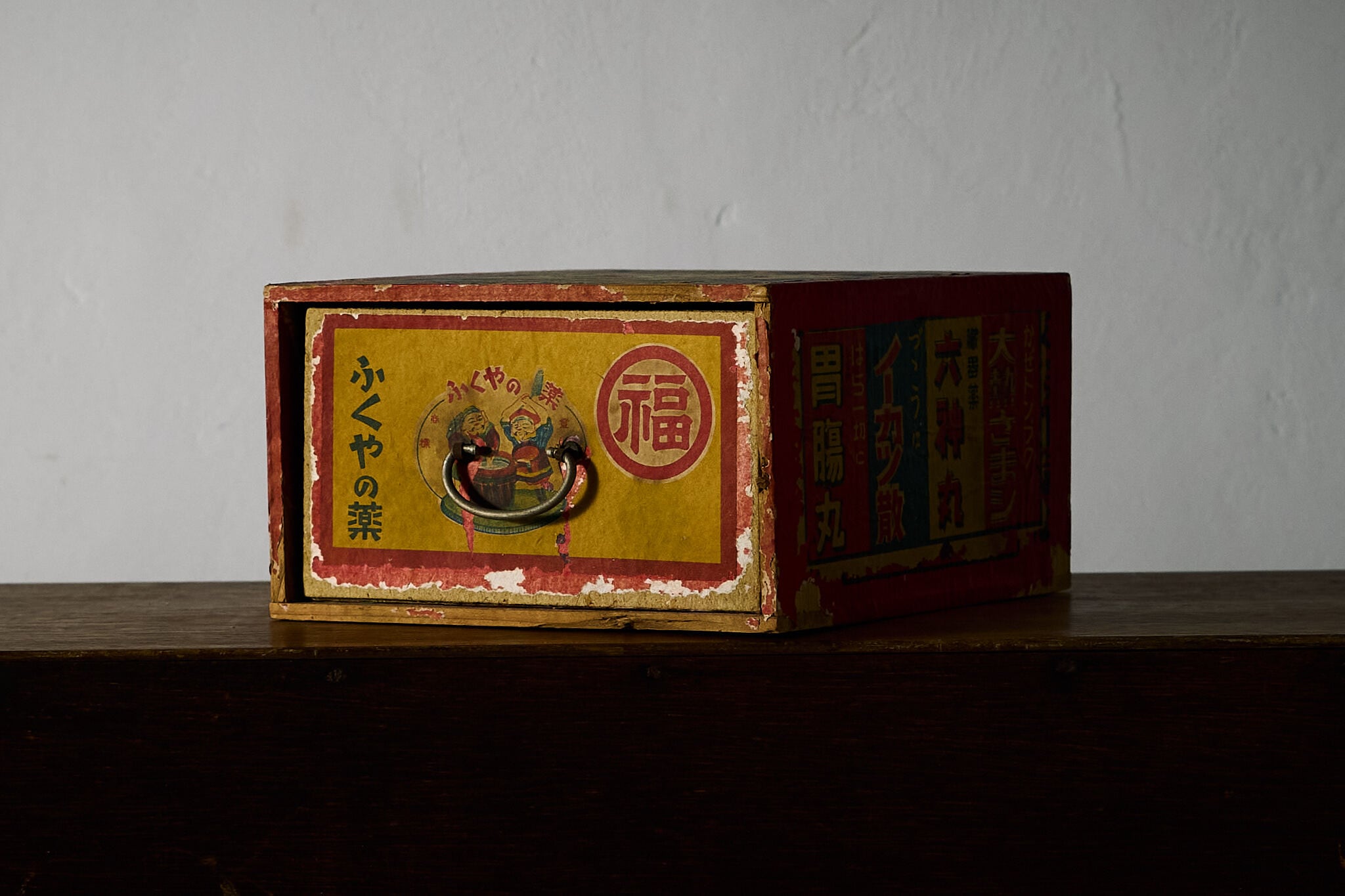 赤い化粧紙にレトロな薬箱ラベルを貼り込んだ小さな引き出し函です。