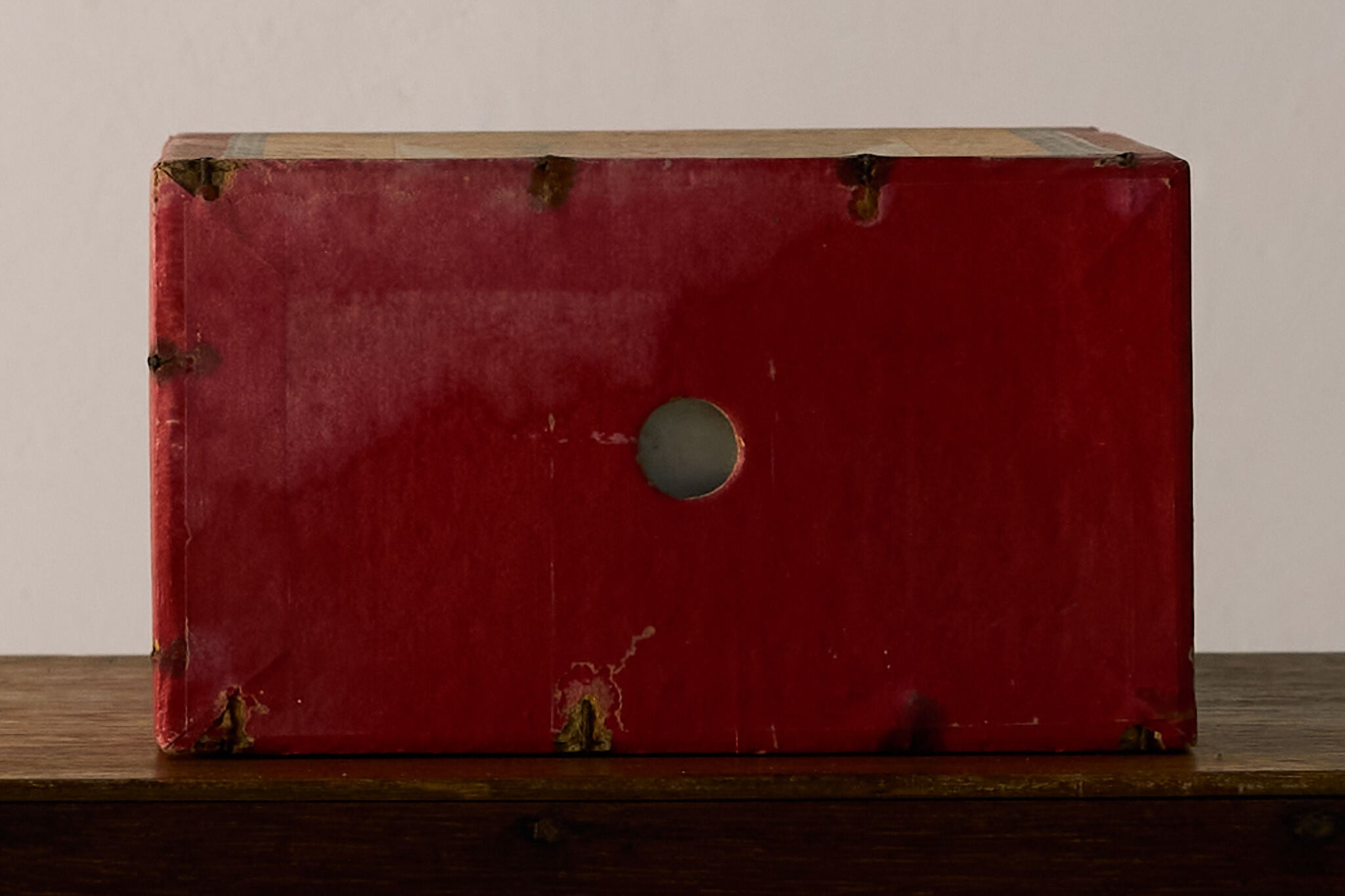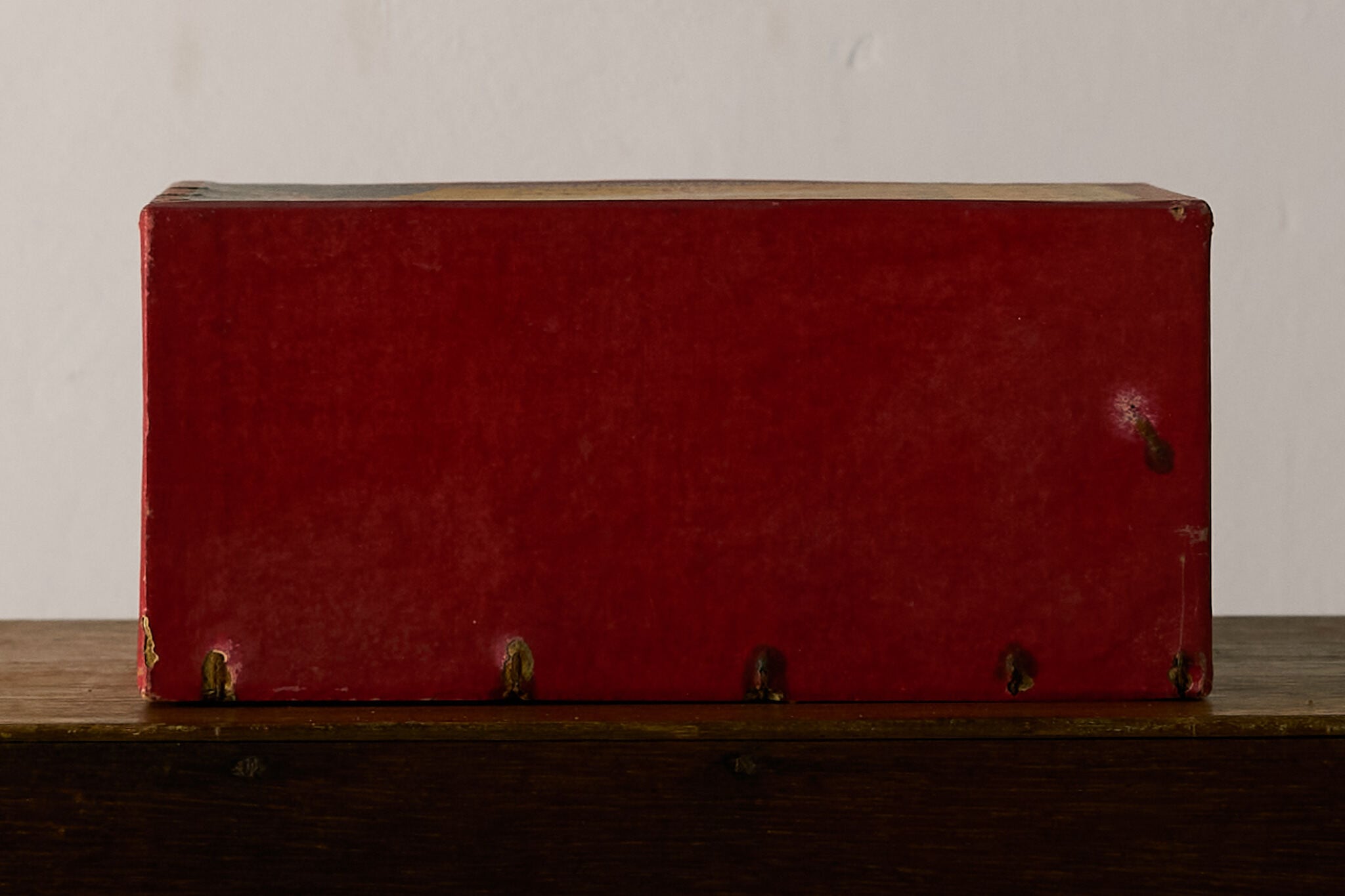 木箱に紙ラベルが巻かれ、金属の丸環取手が愛らしいアクセント。