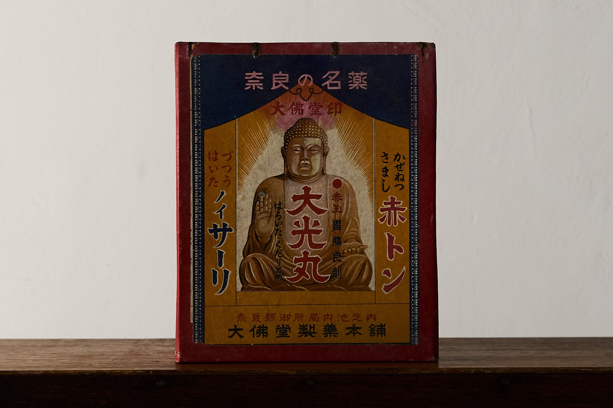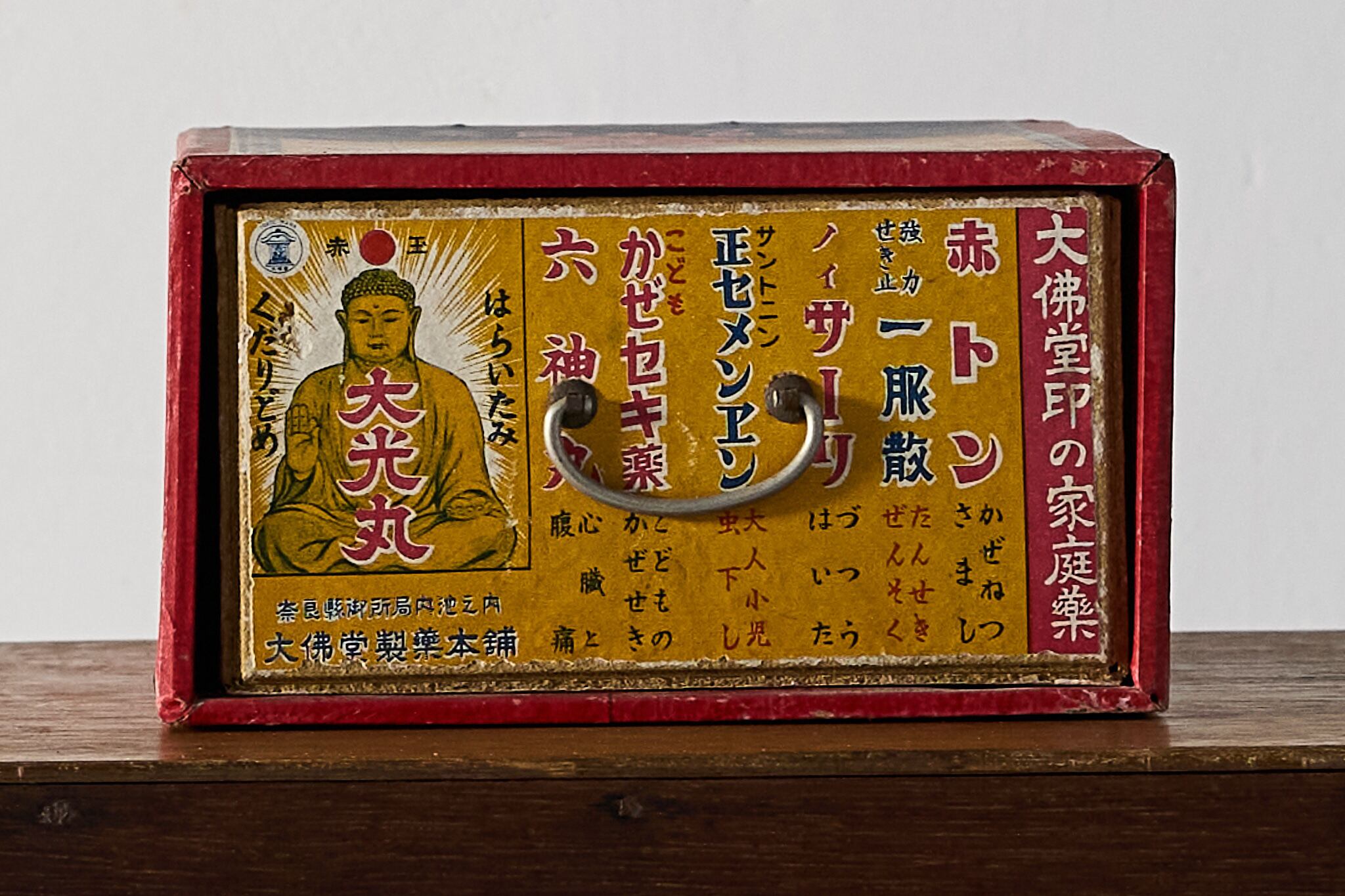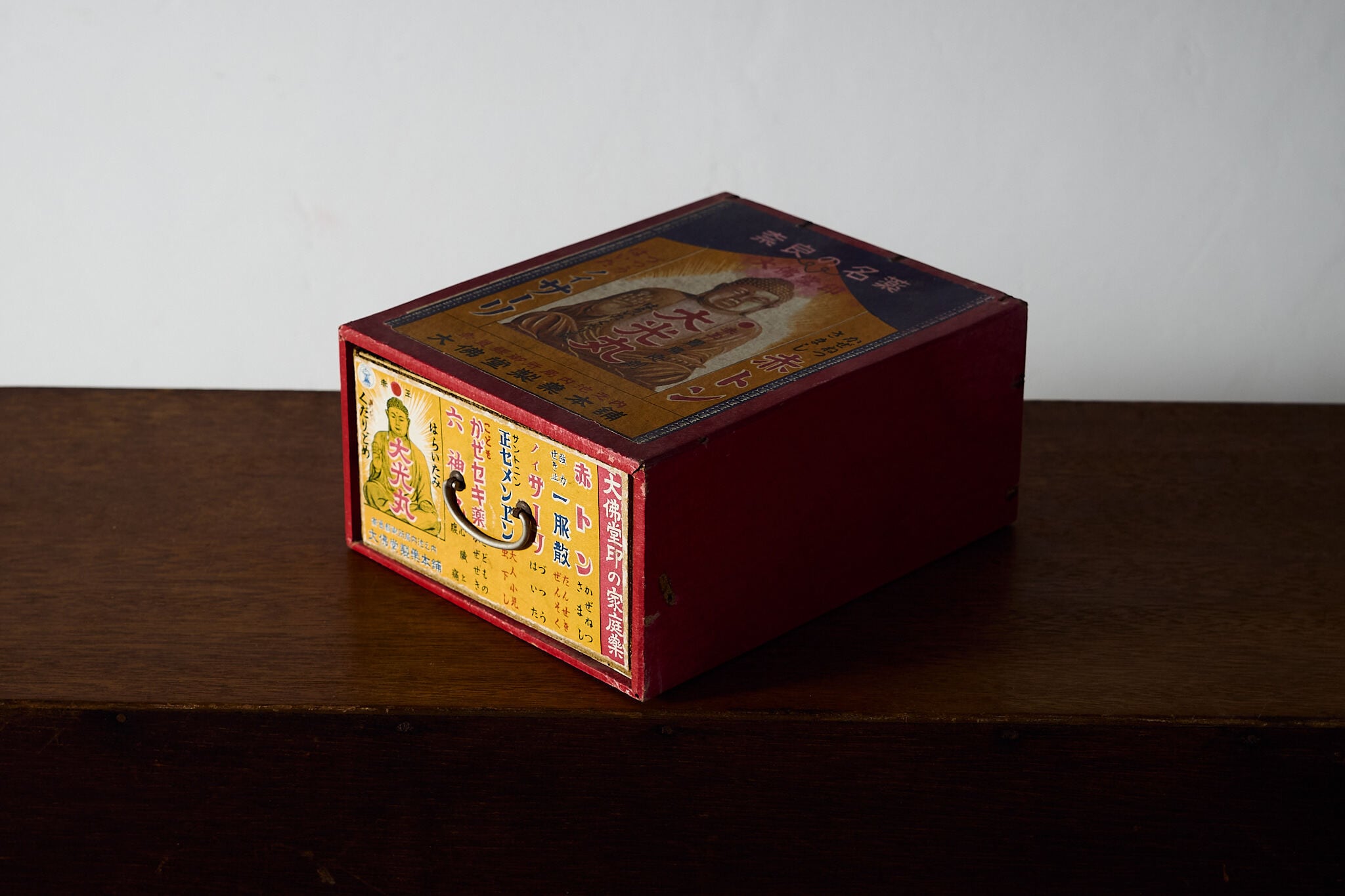 薬箱のフロントに大仏の図案が入った、小さな引き出し箱。