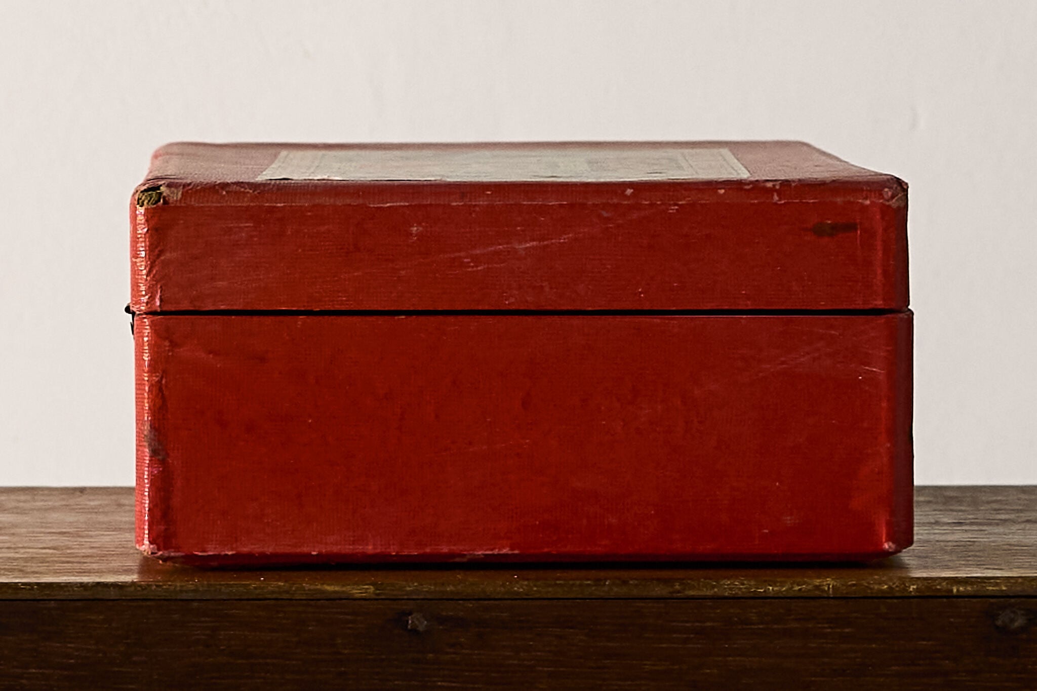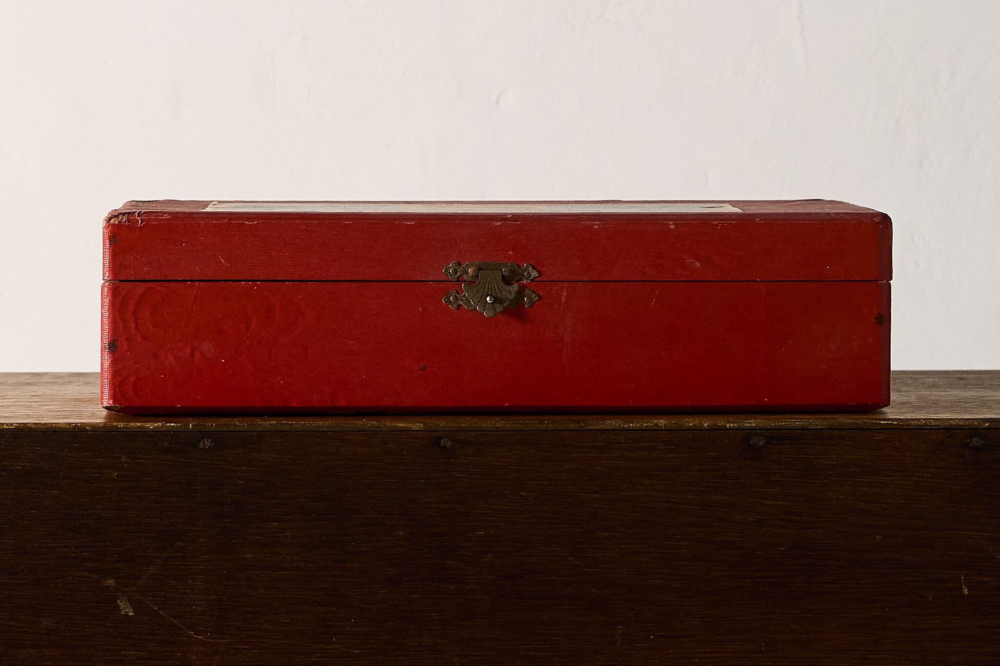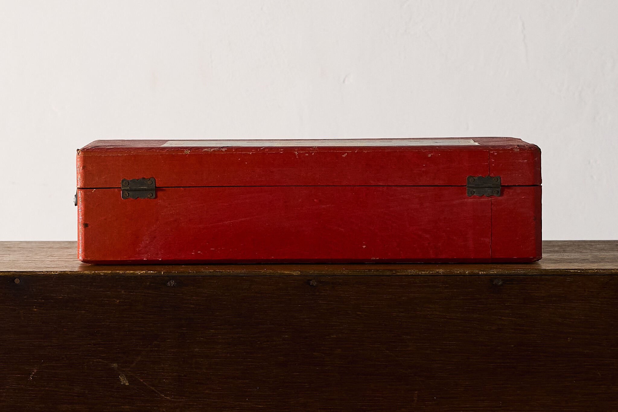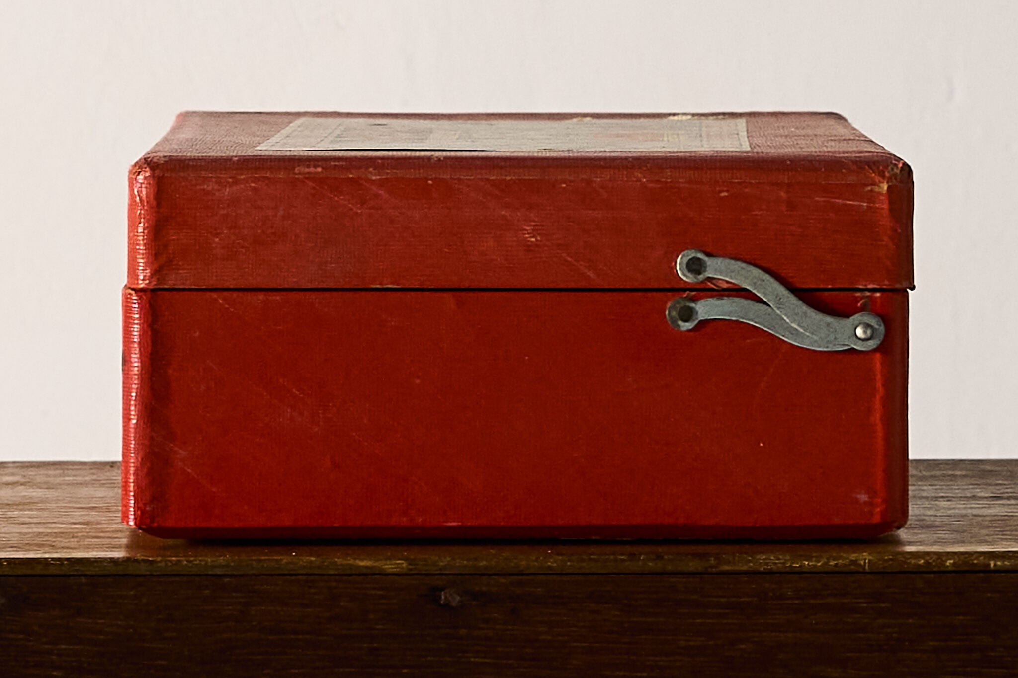 赤いクロス紙で包まれた、金具留めの折り蓋ケースです。