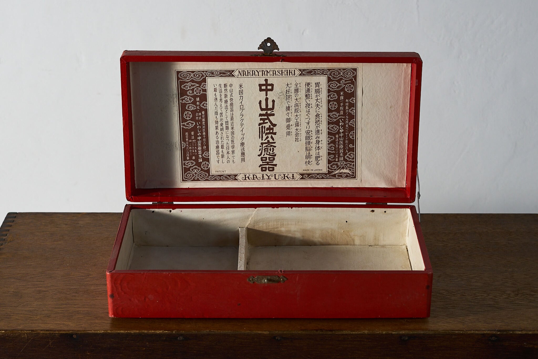 蓋裏には当時の説明票が残り、内側は仕切りで二室。
