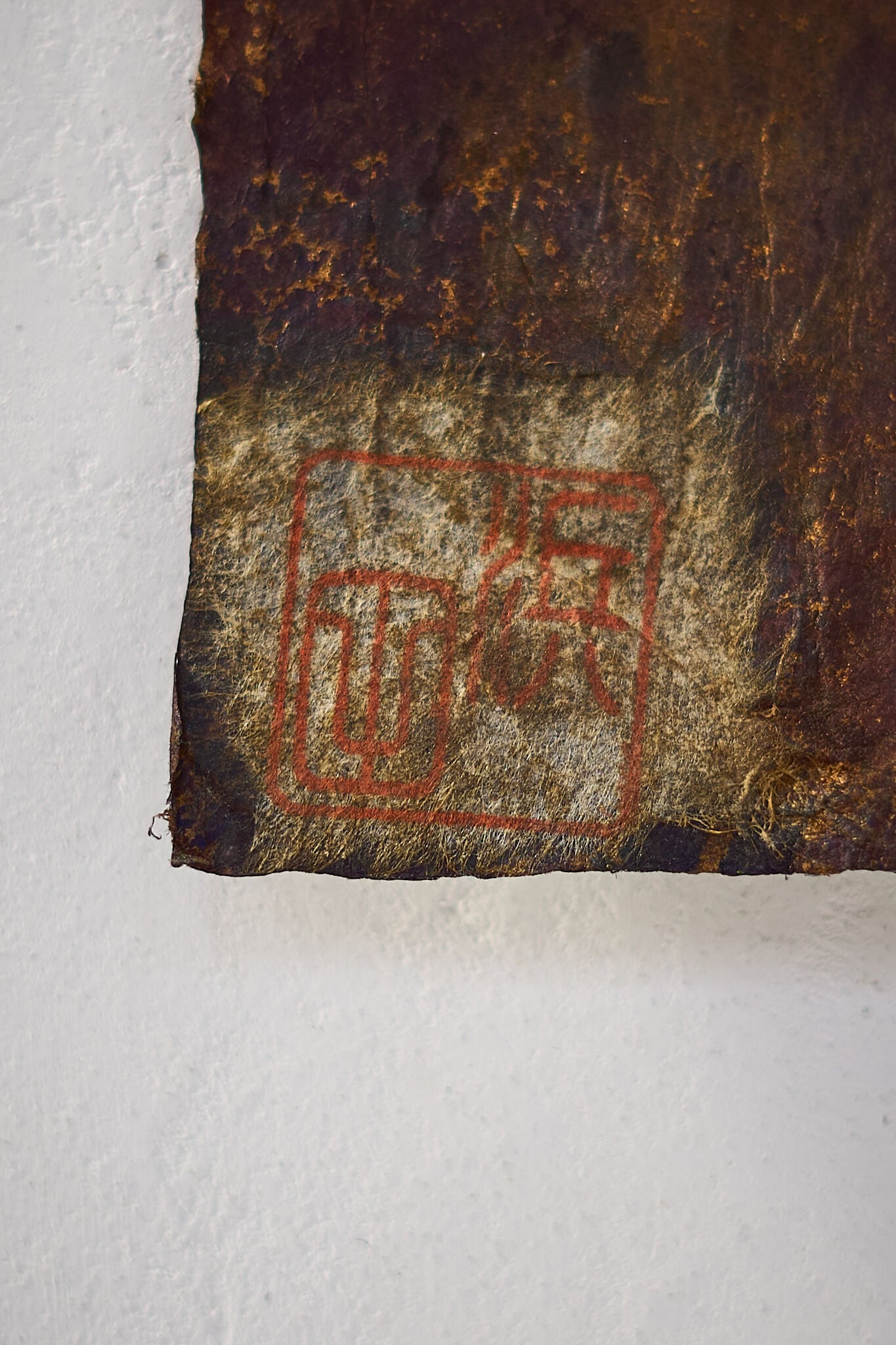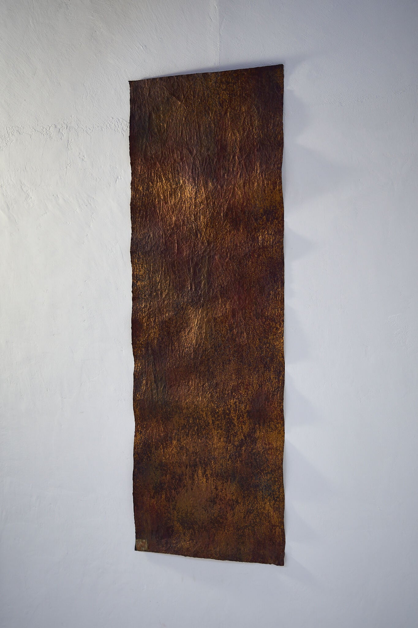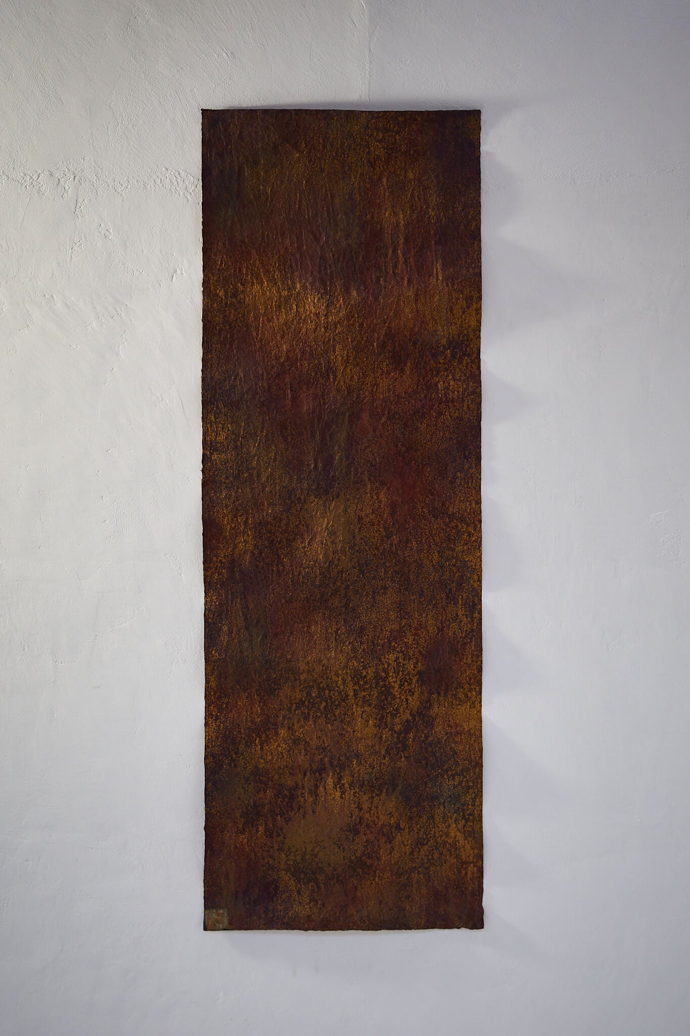 古紙のような肌理に層状の発色がにじみ、見る角度で鈍い光が立ち上がります。