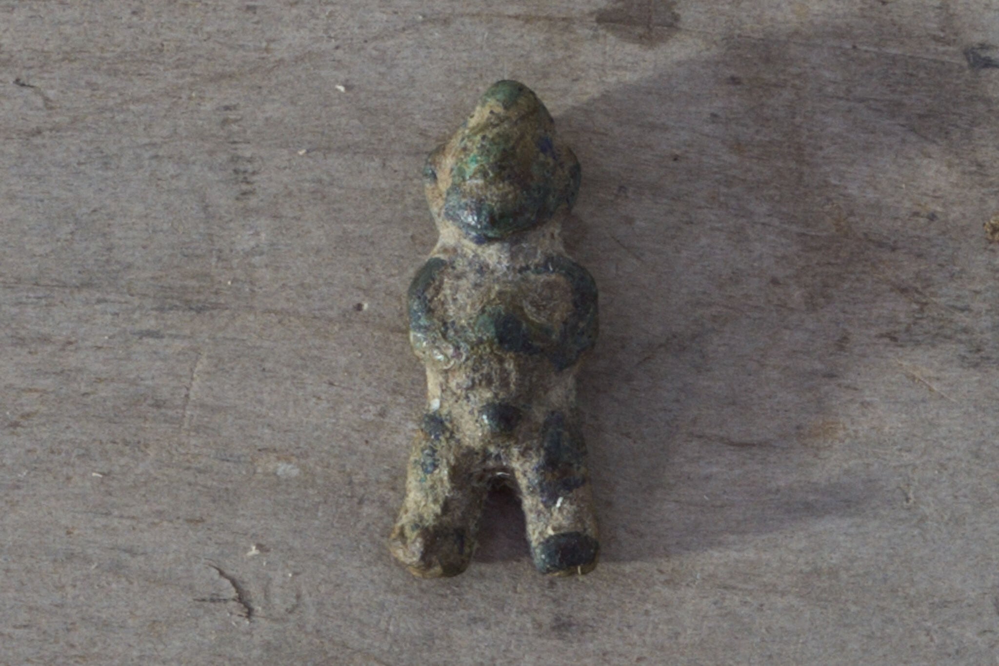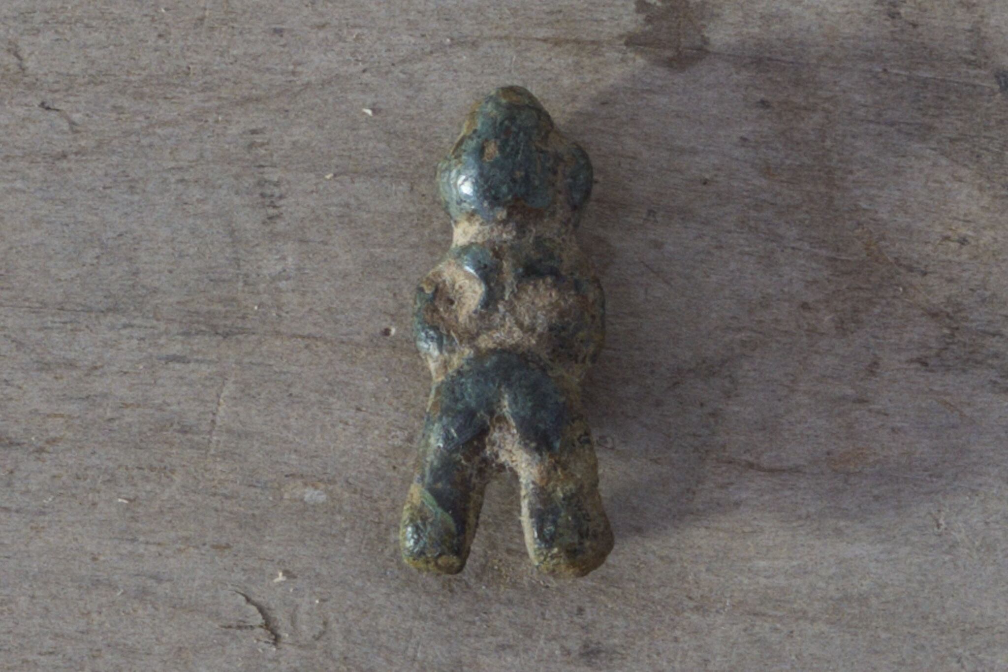 頭巾をかぶり、何かを抱える姿。長い年月を経て深い緑色に変化した石の表情が、独特の風合いを生んでいます。素朴な造形ながら、どこか温かみのある佇まい。小さな棚に、机の片隅に。古いものが好きな方へ、静かに寄り添う一品です。